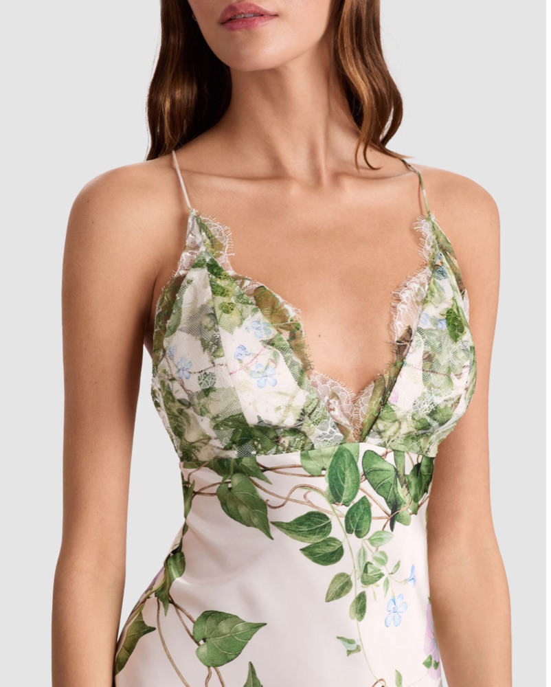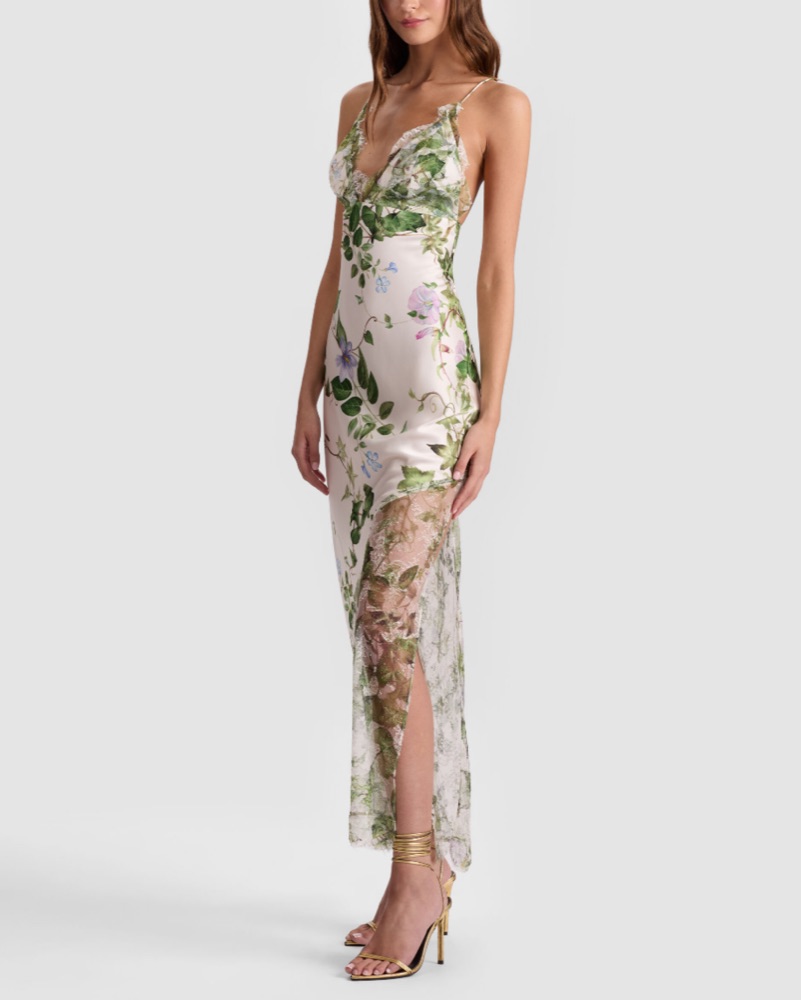 This stunning floral maxi dress is perfect for a special occasion like a wedding or formal event. The delicate floral print and high slit add a touch of elegance and femininity.