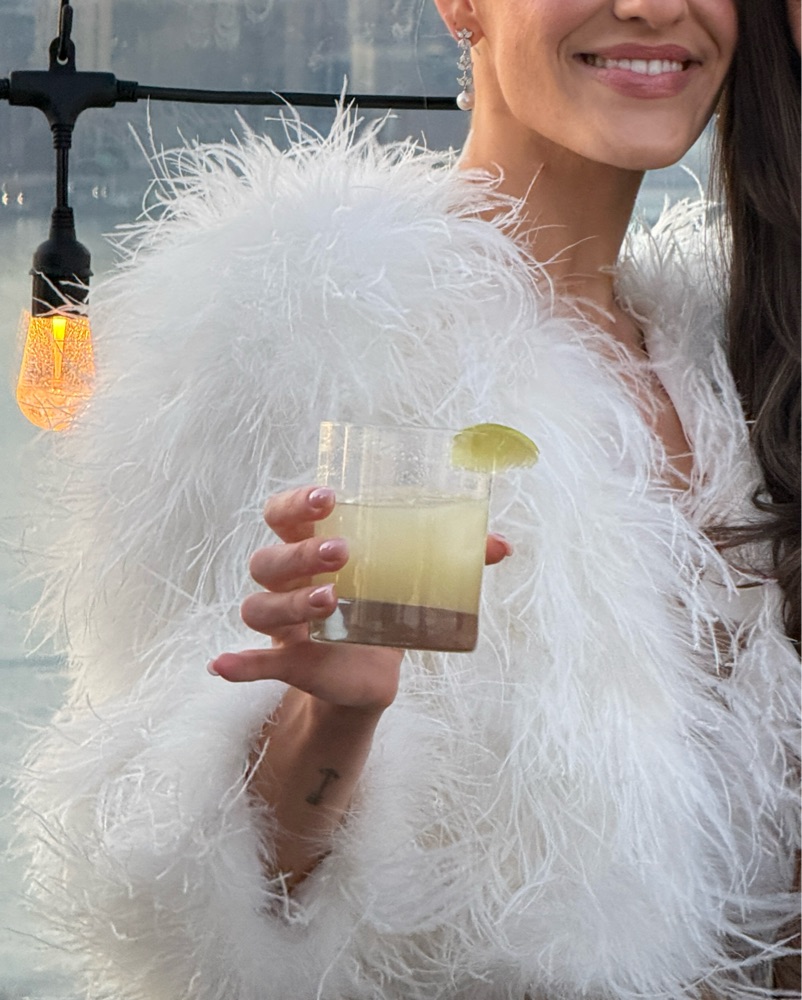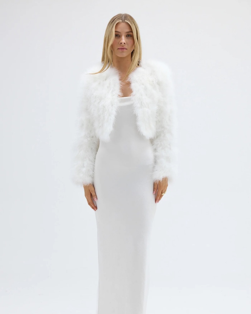 “Manhattan Crop Jacket”. The perfect blend of strong shoulder structure and flattering feminine cropped length, the Marabou feather jacket is sophisticated and stylish. Perfect for a chilly evenings, can be dressed up or down. Amazing for brides!