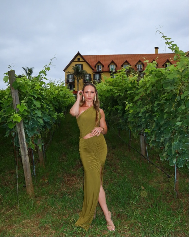This stunning olive green maxi dress is perfect for a special occasion/ destination wedding. The form-fitting silhouette and high slit create a sophisticated and alluring look! Price includes dry cleaning.
