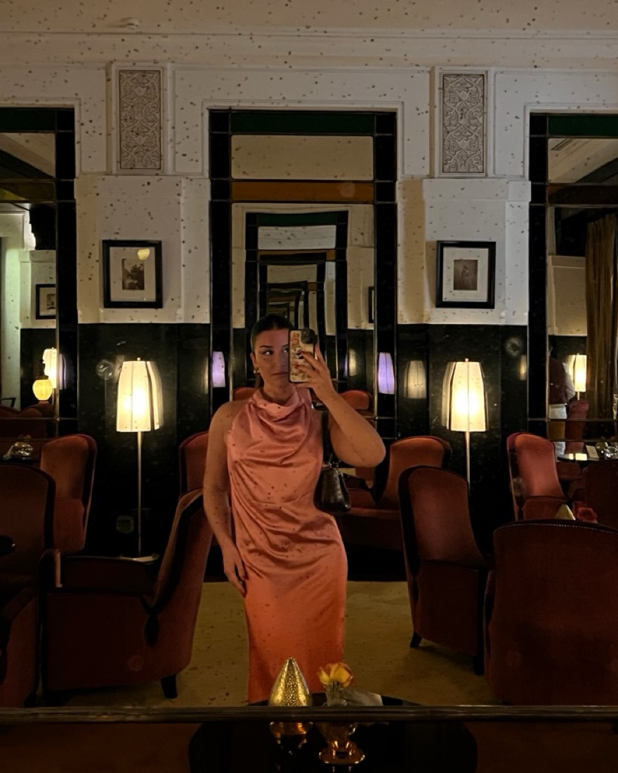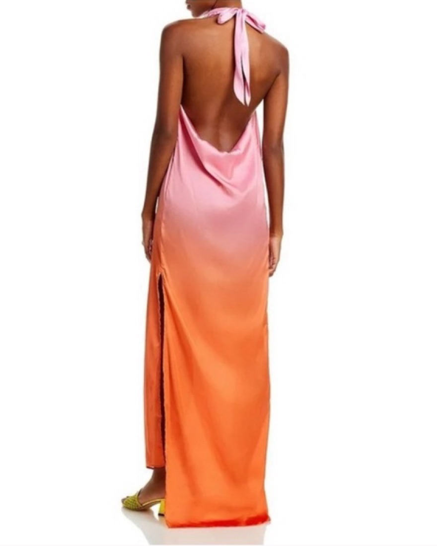 Long silk pink & orange halter dress, perfect for summer and sunny vacations or trips. Very flattering, fits 6-8.