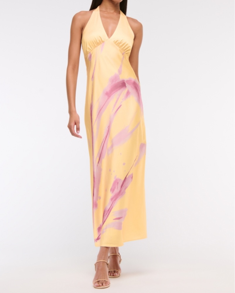 Abercrombie maxi dress in sunset yellow pattern. Features an open-back detail and a plunging halter neckline with adjustable ties for the perfect fit! Great for wedding guest or beach dinner!