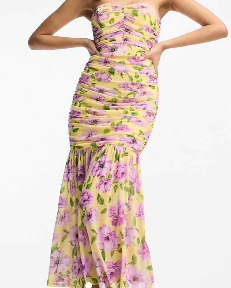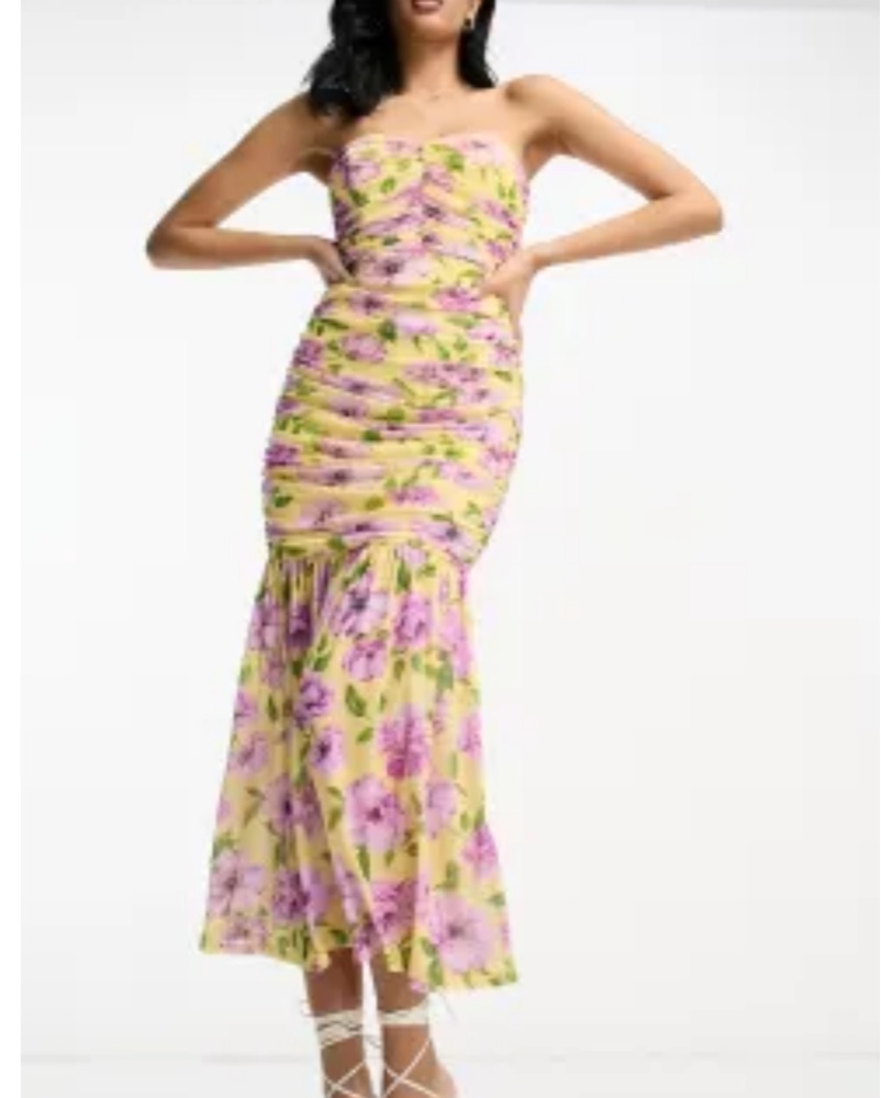 A stunning midi dress featuring a vibrant floral print and ruched detailing for a flattering, figure-enhancing silhouette. Perfect for a summer garden party or outdoor wedding.