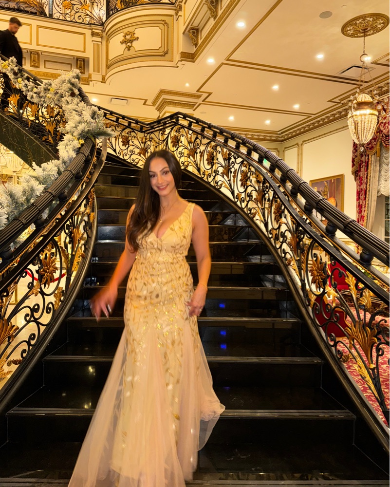 An elegant gold dress with sequin designs and sheer net that flares at the bottom