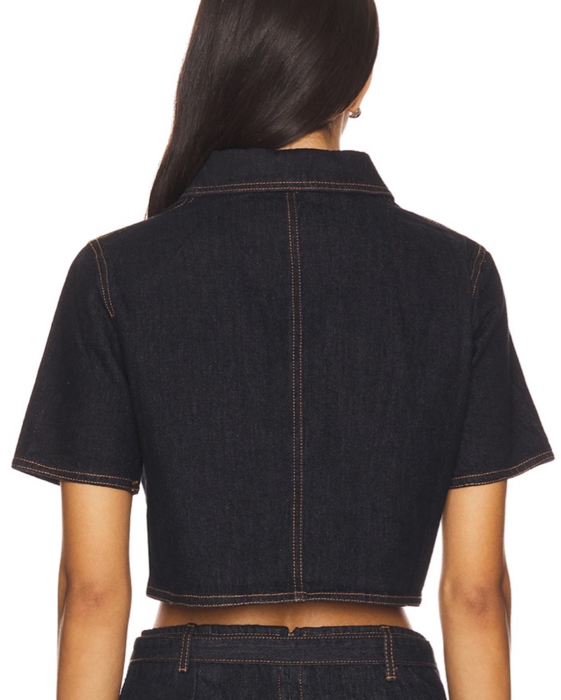 This stylish cropped denim jacket is perfect for adding a touch of edge to any outfit. The gold hardware and stitching give it a modern, elevated look.