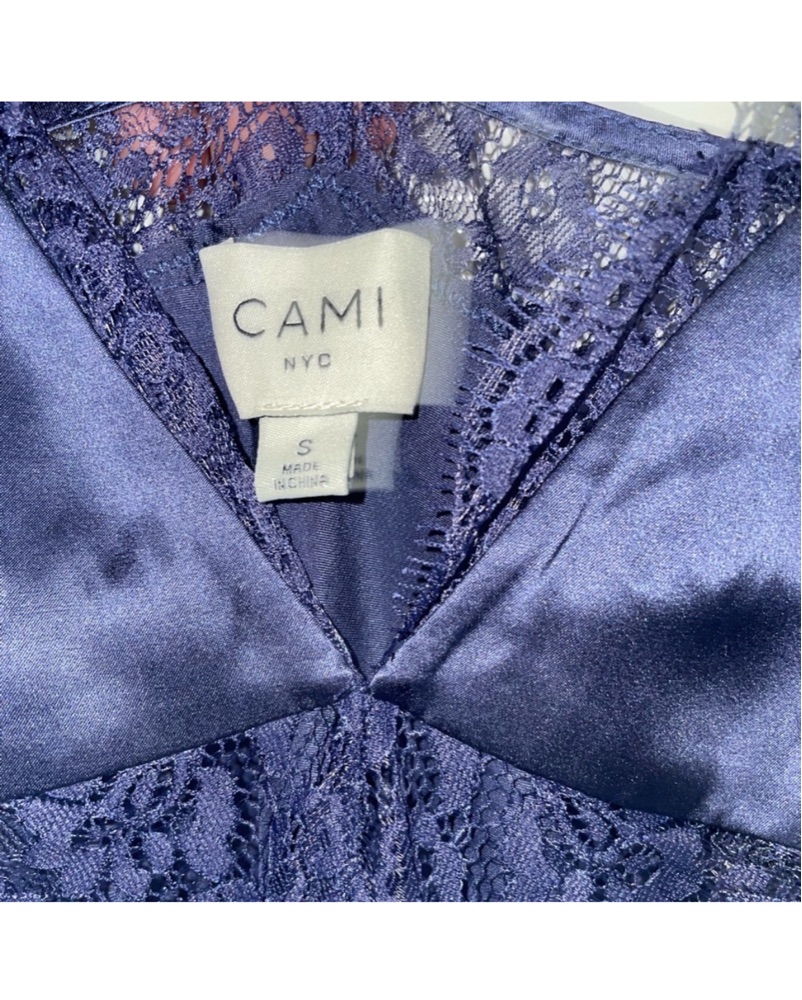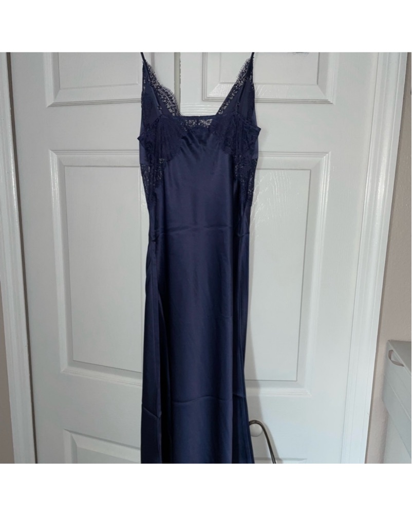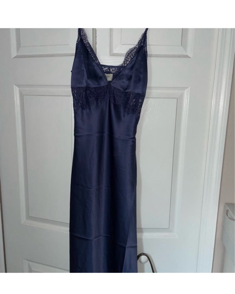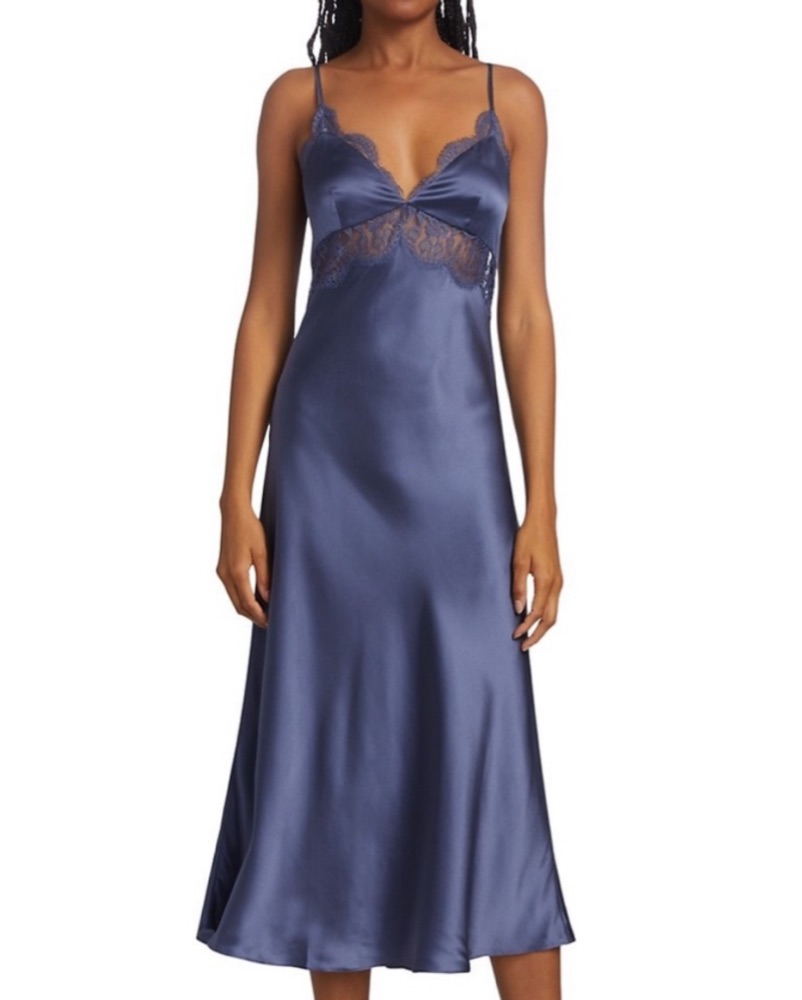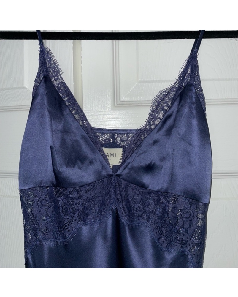 This stunning navy blue slip dress from CAMI NYC is the epitome of elegant sophistication. The flowing satin fabric and delicate lace detailing create a captivating and alluring look, perfect for a formal event or special occasion.