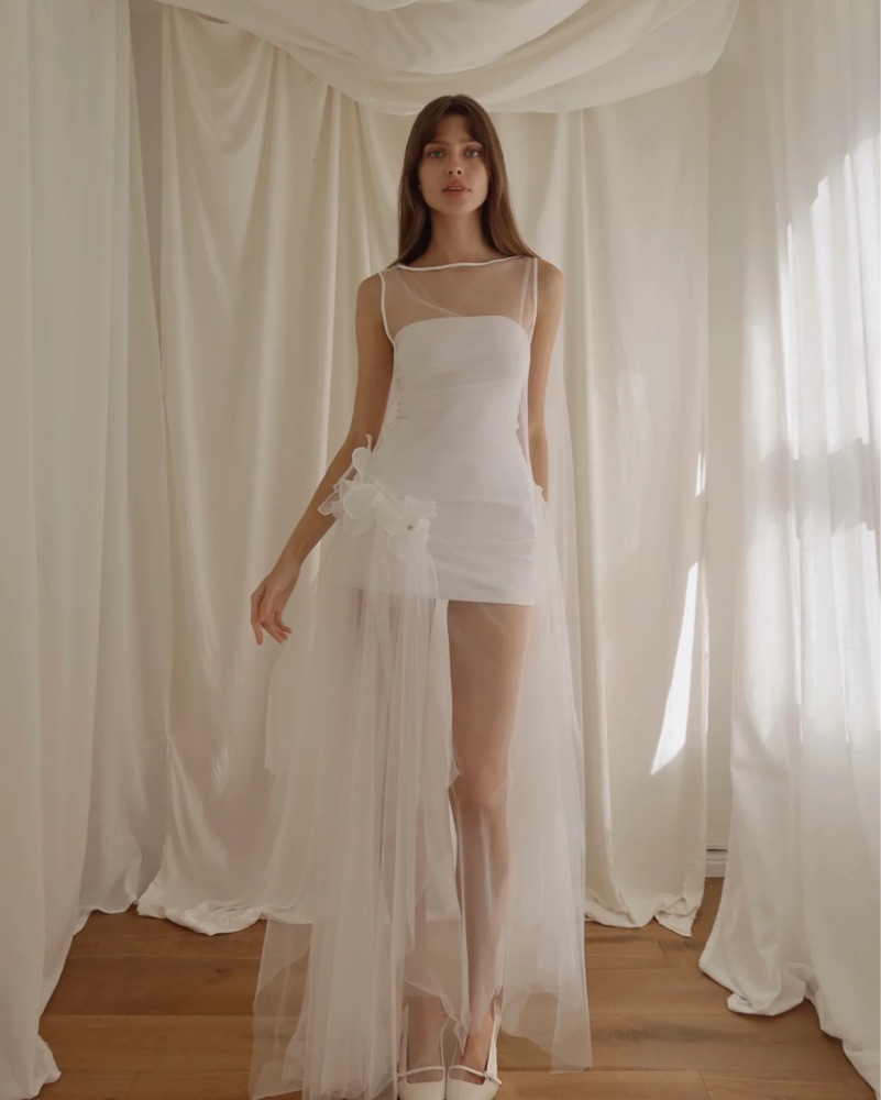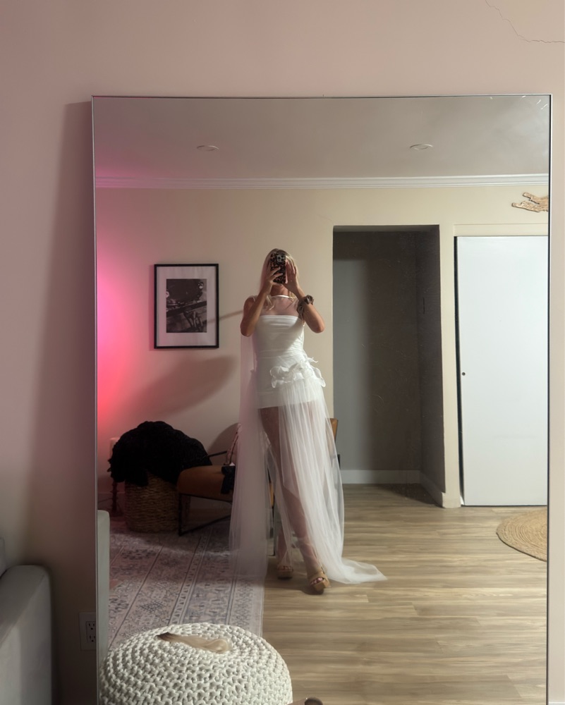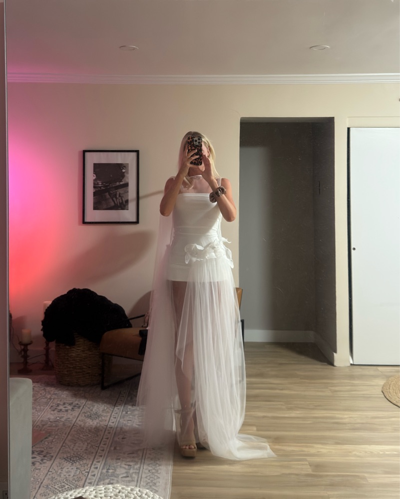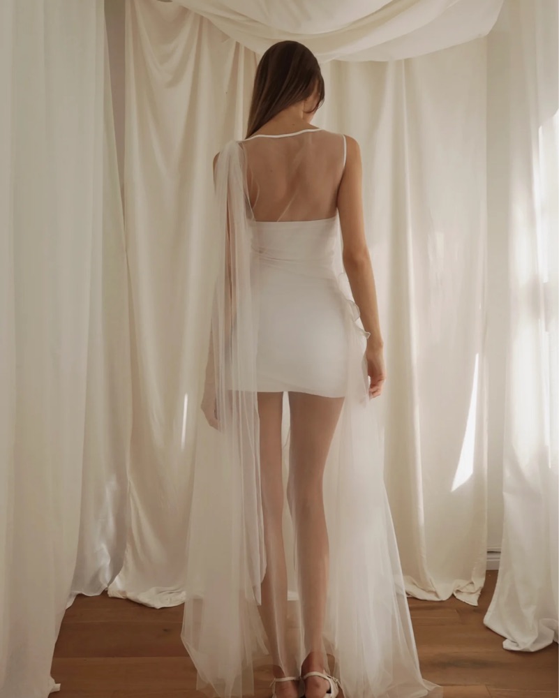 This stunning white sheer dress is perfect for a special occasion, such as a wedding or formal event. The delicate fabric and flowing silhouette create a romantic, ethereal look. Please handle with care, this is true white, mini dress comes with outfit, it’s tight