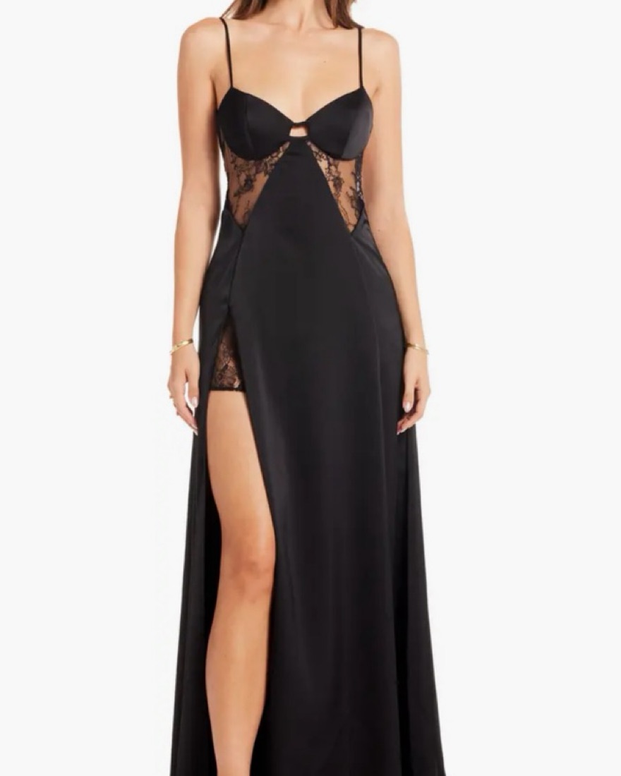 Turn heads at your next special occasion when you enter in this sweeping satin gown inset with tantalizingly sheer lace panels and boasting a soaring side slit.