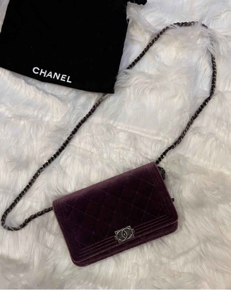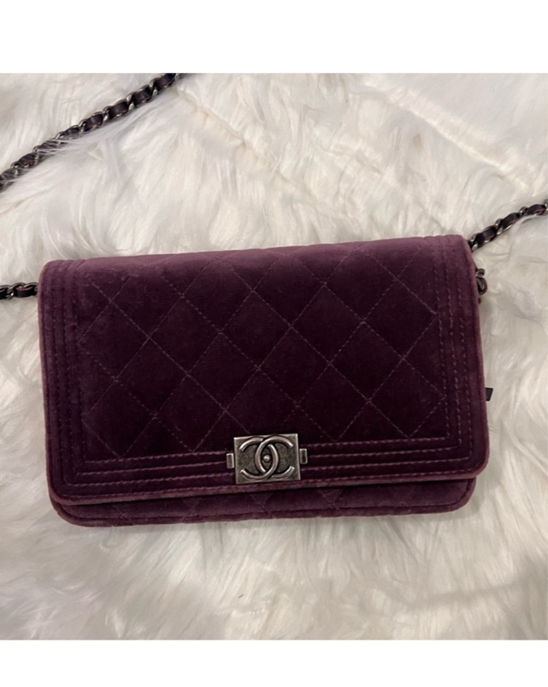 This elegant Chanel crossbody bag in a rich, plush velvet material is perfect for elevating any outfit, from a chic day look to a night out on the town.
