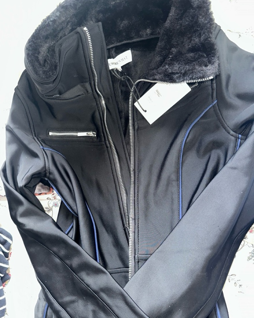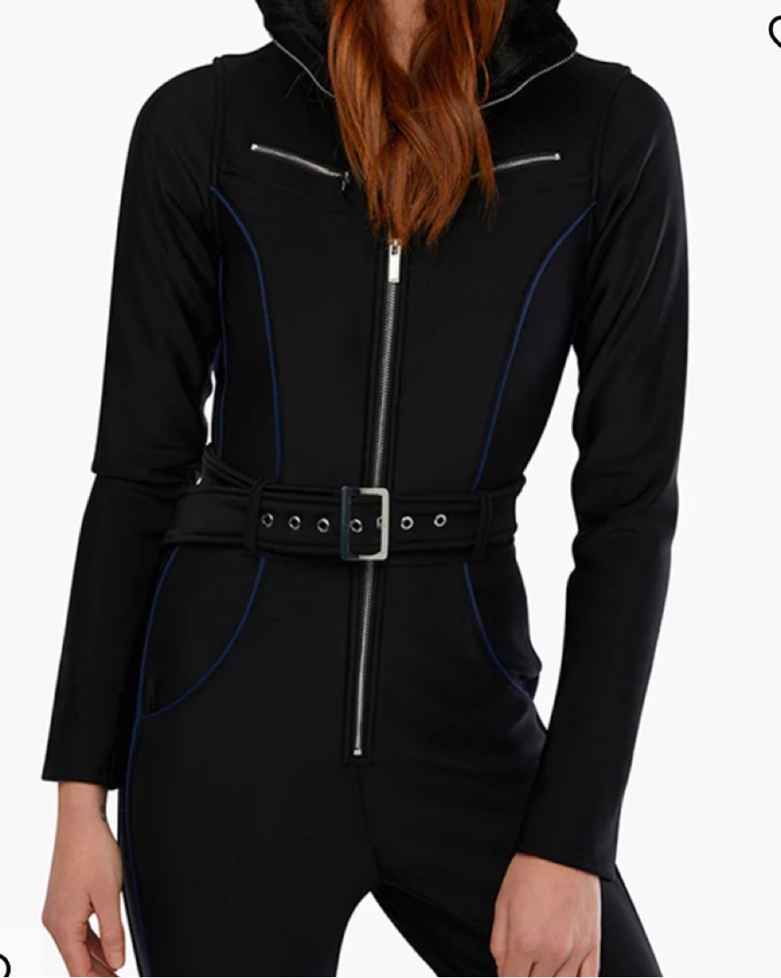 * Brand new item* This fitted ski suit is made from water-resistant, fleece-lined scuba with a zip front, adjustable buckle waist belt, piped princess seams, and internal stretch stirrups. The removable hood is lined with faux fur and large enough to fit over a ski helmet.