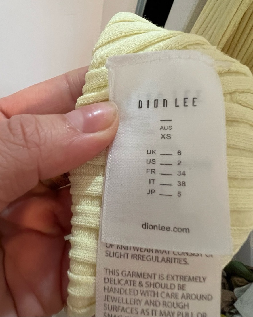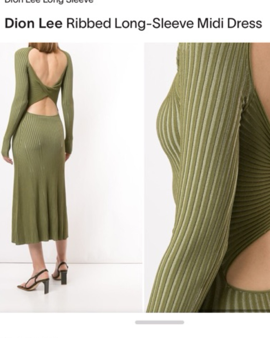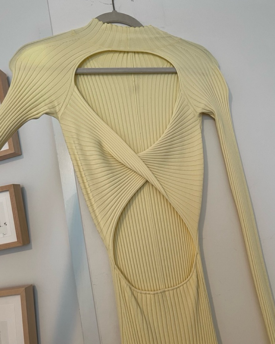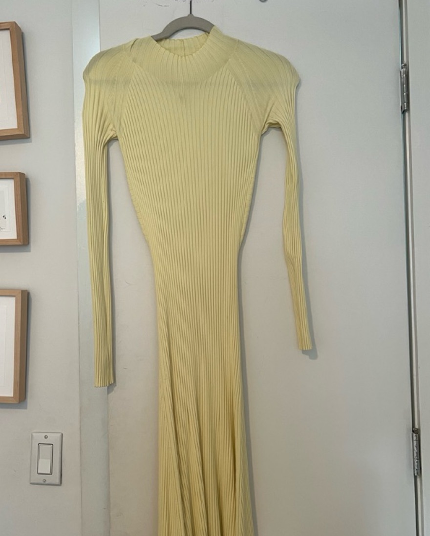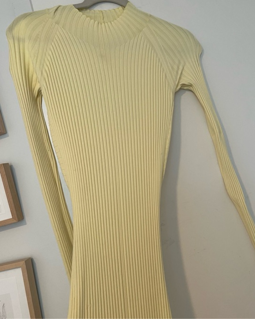 Added images of the green for visual of the fit! Light yellow cotton ribbed knit open back round neck long sleeves mid-length