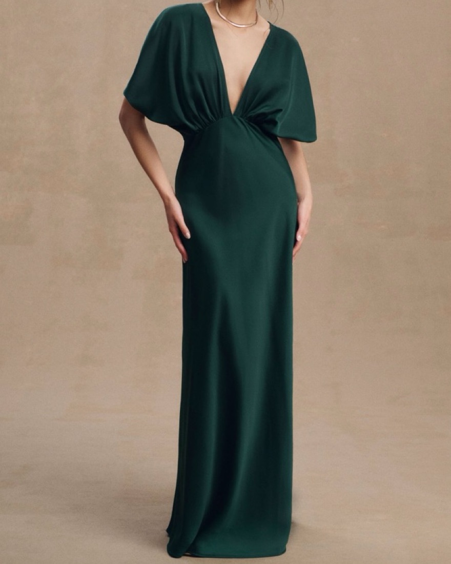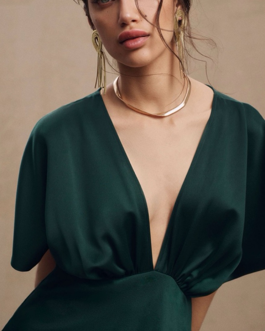 Fits 2/4. Emerald green color. Timelessly elegant, the BHLDN Leila Deep-V Flutter-Sleeve Satin A-Line Gown pairs a gracefully draped bodice with soft sleeves and a flowy skirt. A daring plunge neckline completes the look. Invisible side zipper. Short flutter sleeves. Worn once as wedding guest.