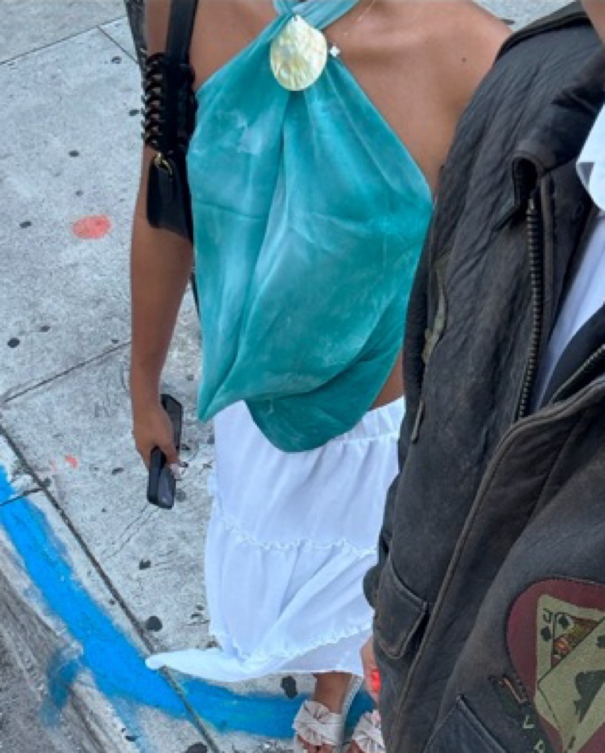 *Exclusive print* Aquamarine tie dye halter top with a low, cowl-draped cutout and cute shell embellishment in the front. Semi-sheer fabric, features an open back with an adjustable strap.