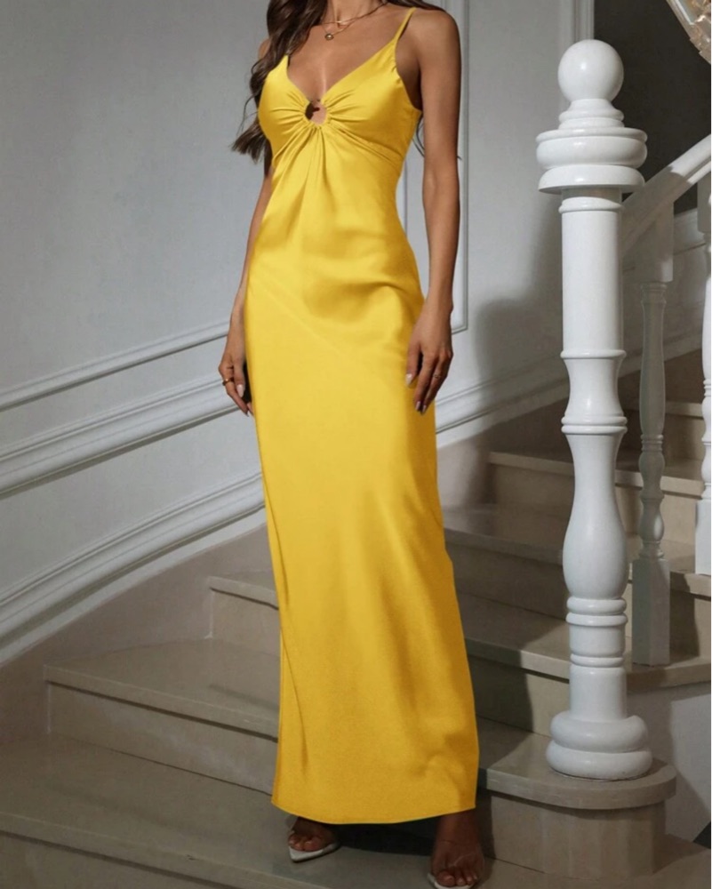 stylish yellow silky satin maxi dress with gold ring detailing. 🤩 Perfect for Vacations and Wedding Guests. Cavalli designer dupe (see my page for real Cavalli!)