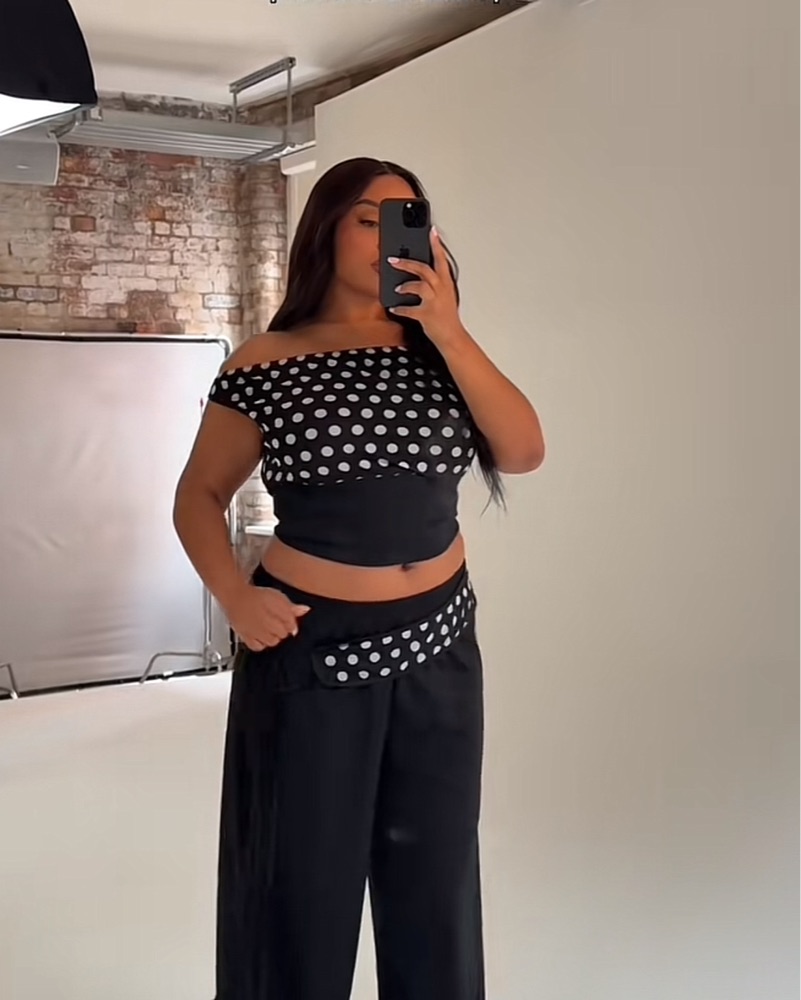 This chic polka dot set is perfect for a night out or special occasion. The off-the-shoulder crop top and wide-leg culottes create a stylish and flattering look.