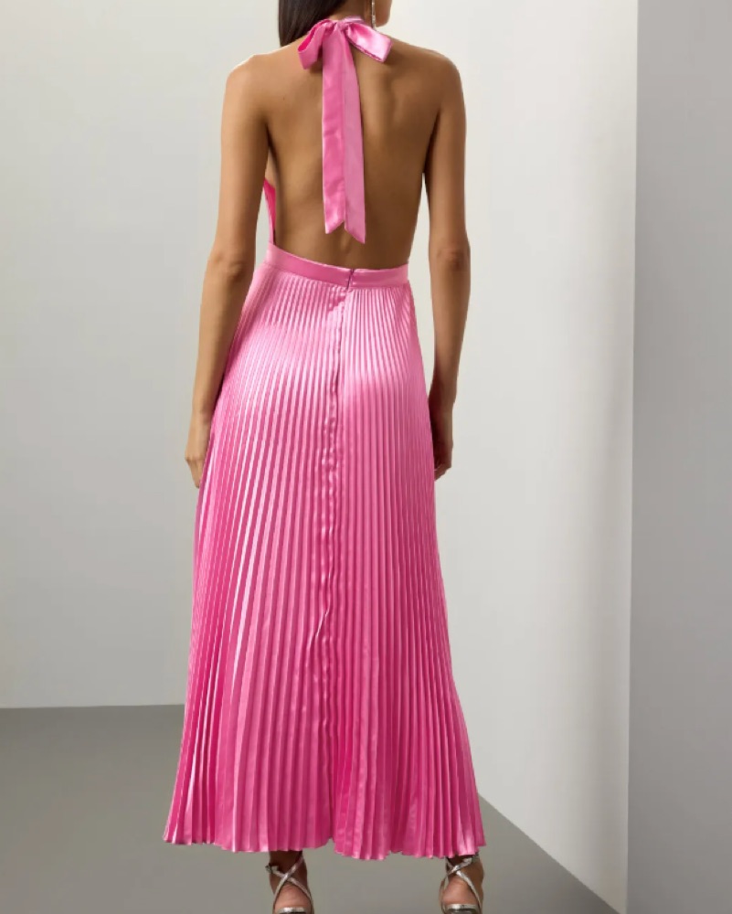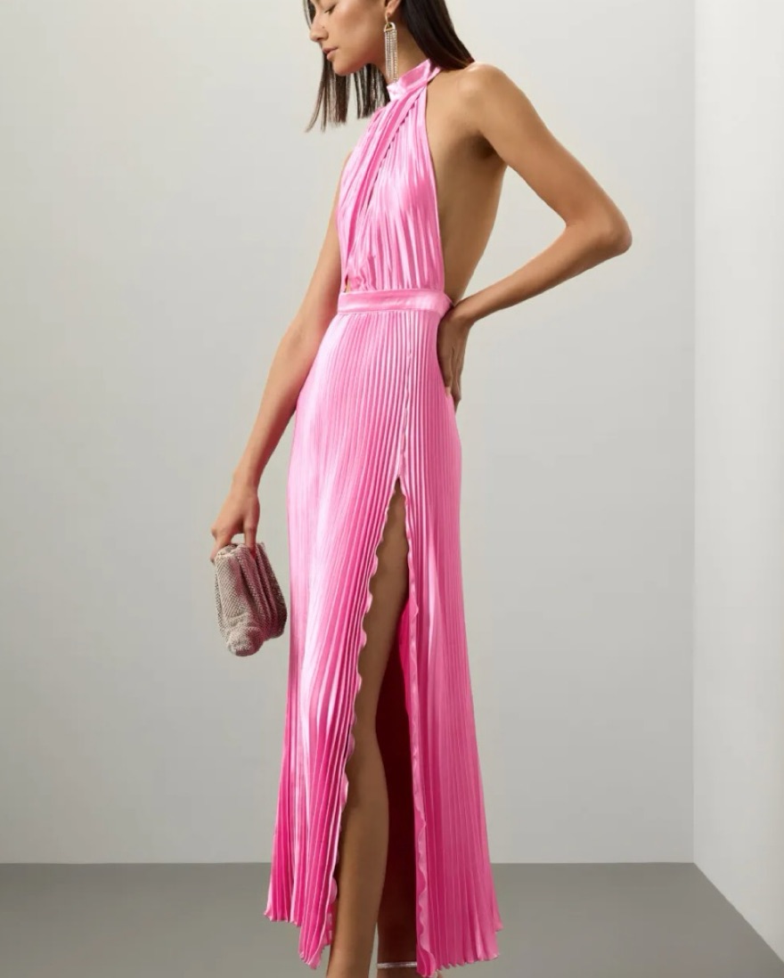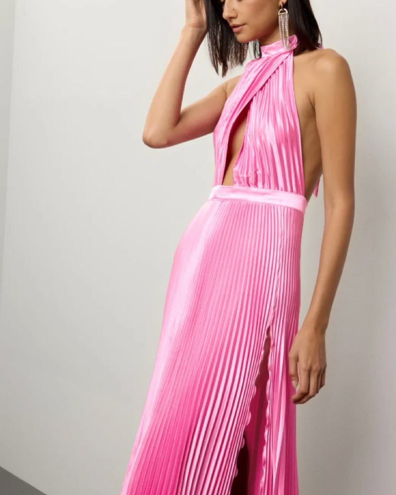Sold out on revolve! // This vibrant pink halter neck dress by L'IDÉE is crafted with pleated fabric. The open back adds a touch of drama and allure to the dress, making it a standout choice for your next formal affair. // worn once! AUS 8/S