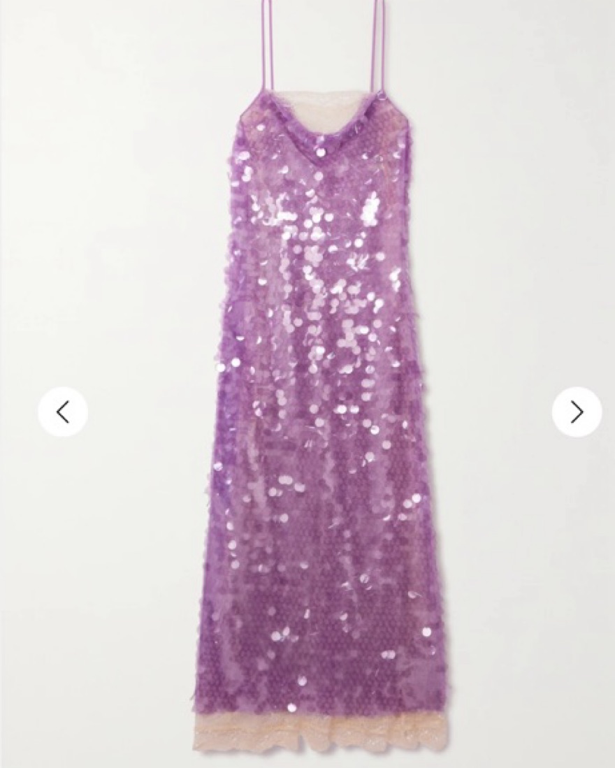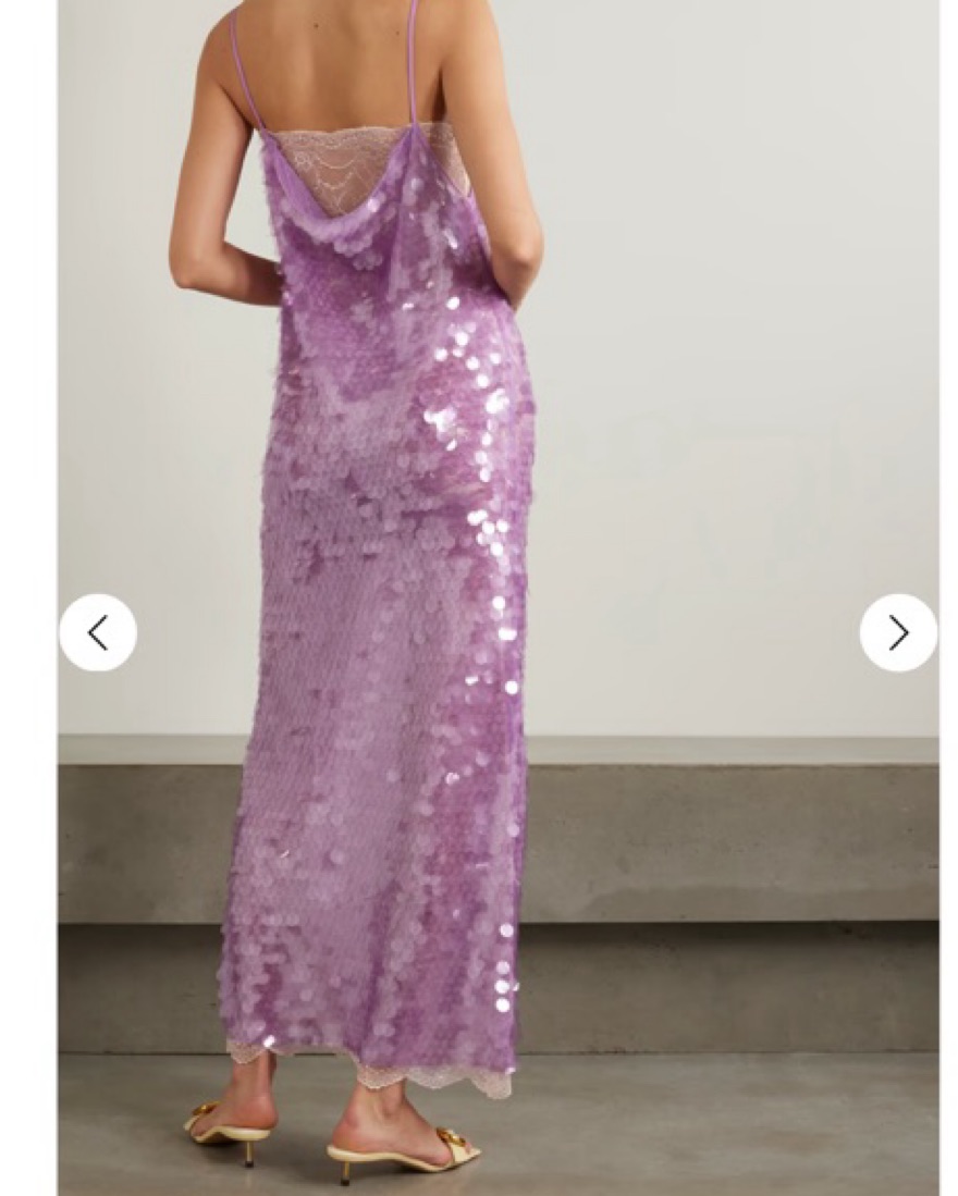 SIEDRÉS Kebi lace-trimmed paillette-embellished mesh maxi dress. Lace underlay, purple sequin, floor length. Slightly sheer
