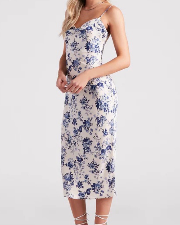 Blue and white floral satin dress