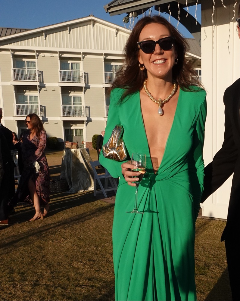Martini Jersey Plunging Gown A stunning gown with plunging V-neck and genius twist front detail at the waist. The shoulder pads and long sleeves create that red-carpet-ready vibe, making this beauty perfect for formal events, galas, or any occasion.