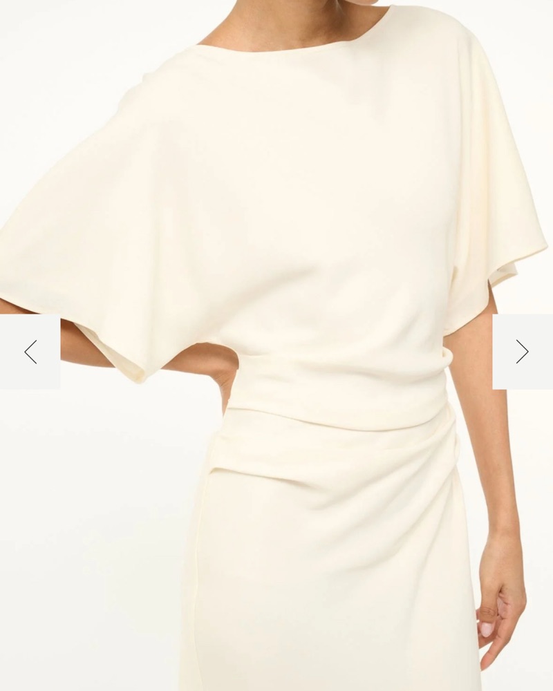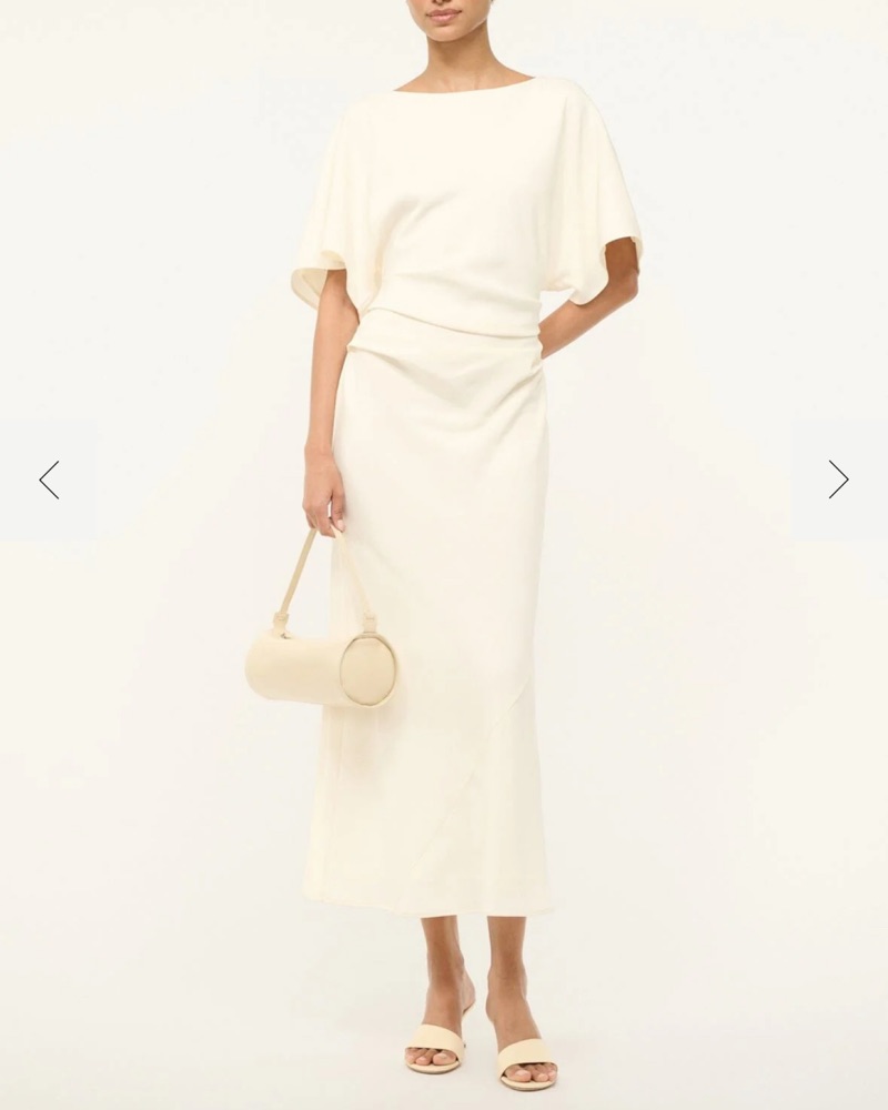 Amelie gathered crepe mini dress. The Amelie is a midi length dress with a boat neckline and dolman sleeves. It features a center back slit and ruching at the waist creates a gentle drape.