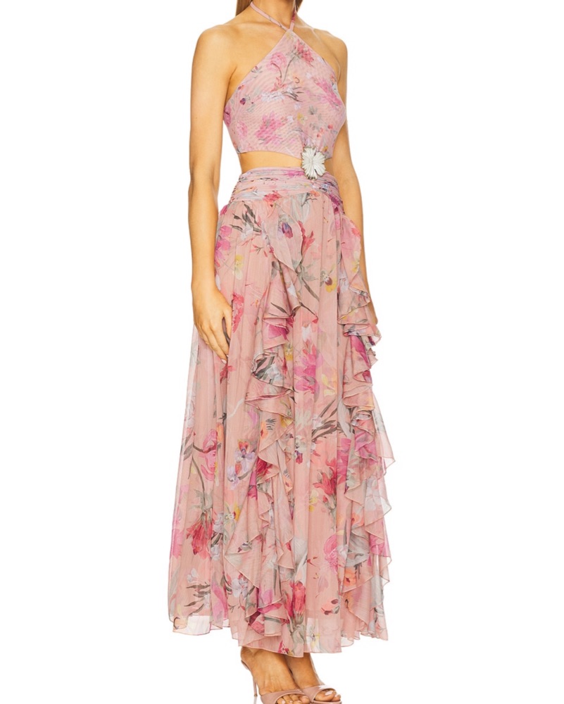 A feminine and flowy maxi dress perfect for a spring or summer occasion. The ruffled skirt and halter neckline create a flattering, romantic silhouette.
