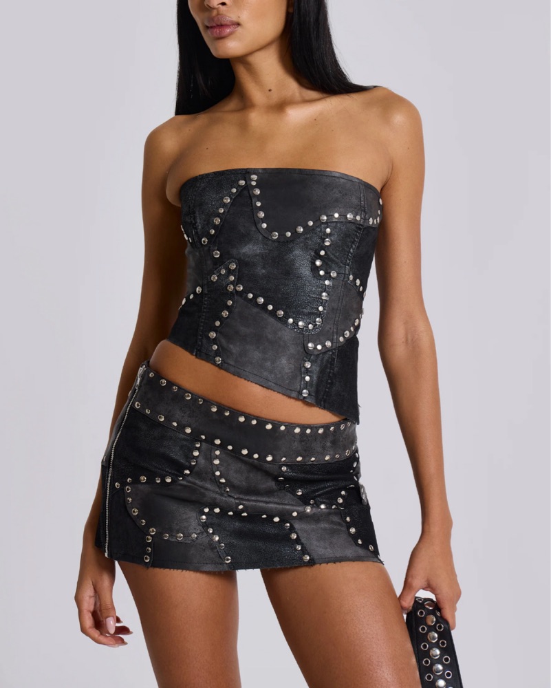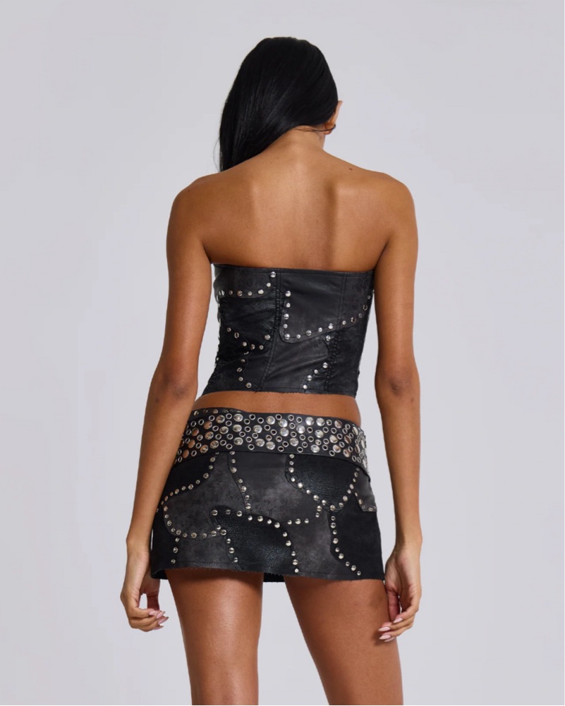 Faux suede, studded mini skirt with side zipper. Please don’t wash/get wet as studs will tarnish! Matching corset on my page 🩶 UK 8/US 4