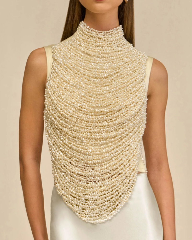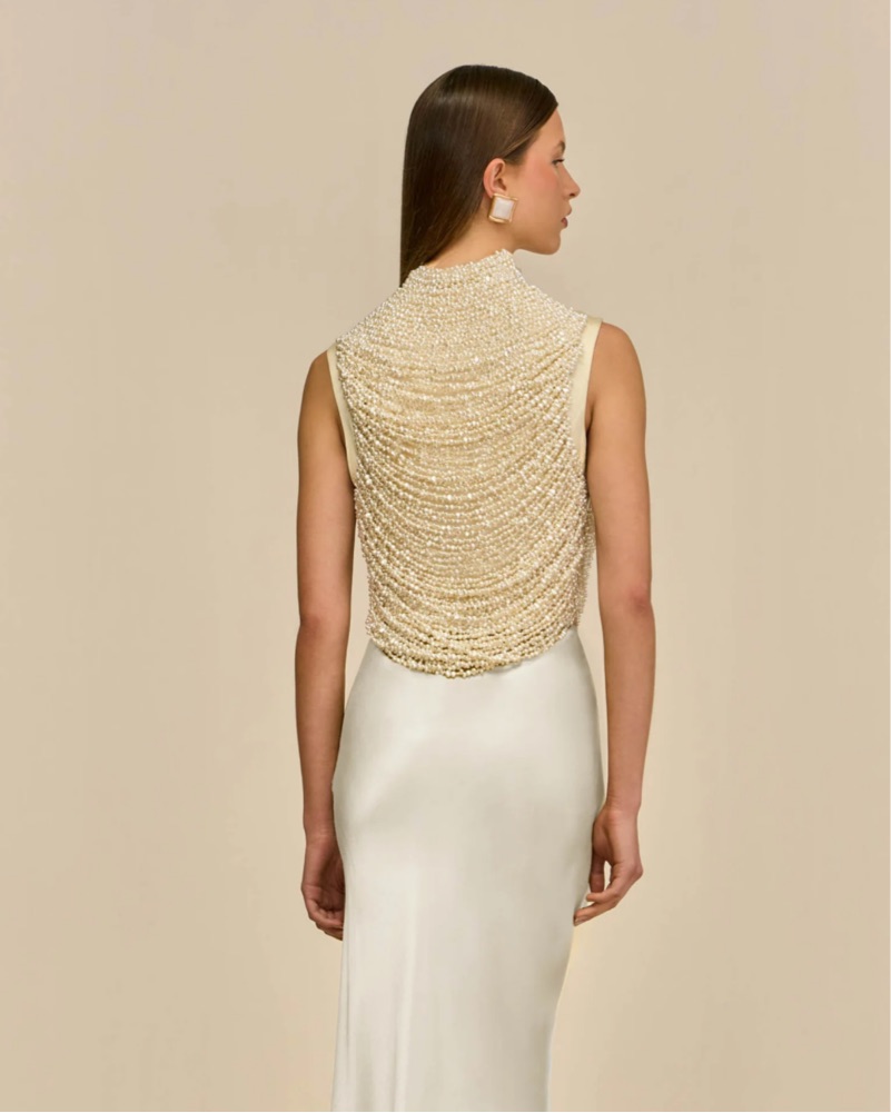 An artisanal top rendered in hand beaded faux pearls over a mesh underlayer.
