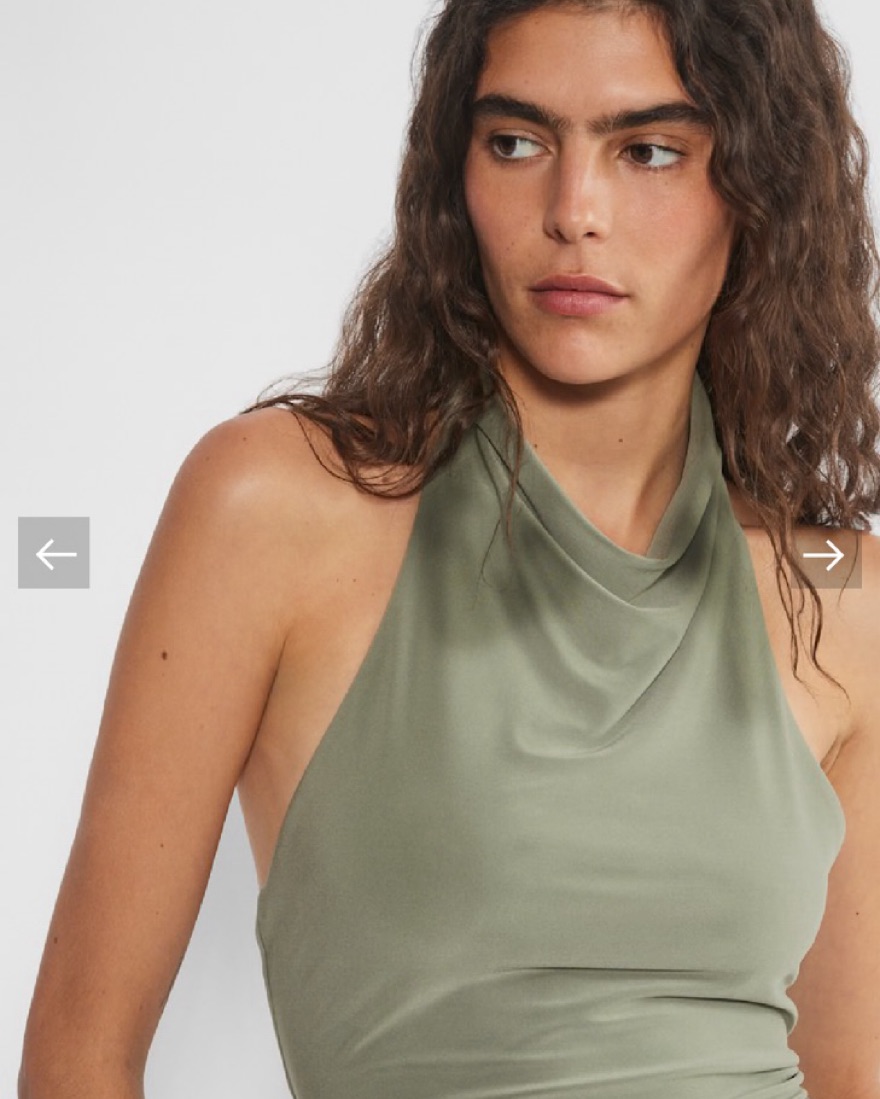 This is a halterneck top in sage green with a cowl neckline. It’s made with drapey stretch jersey with a luxe, sleek feel and soft sheen. Worn 1X, in perfect condition.