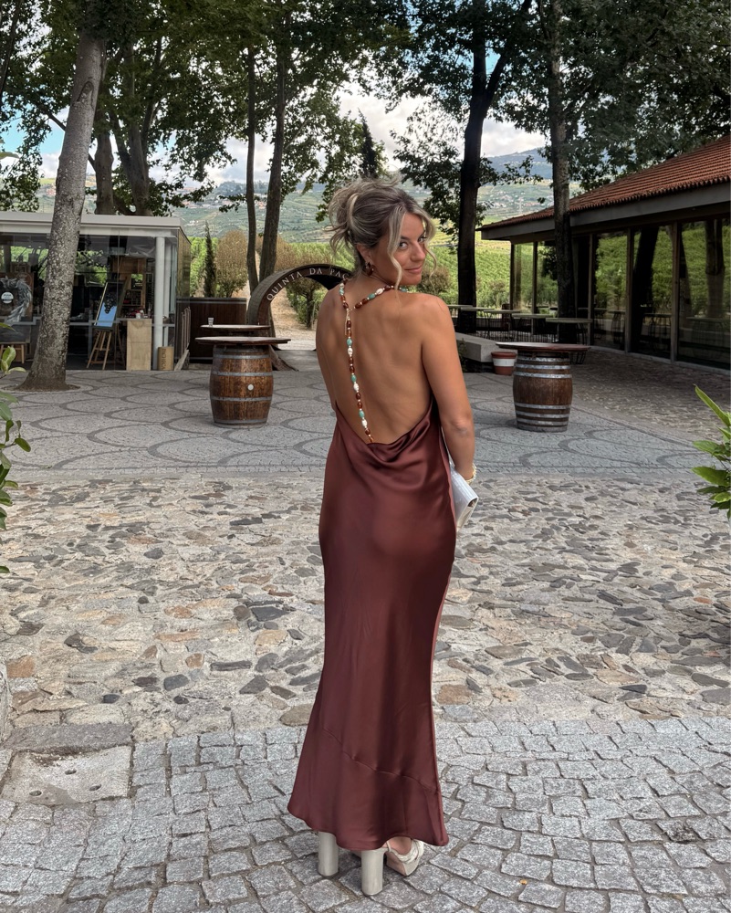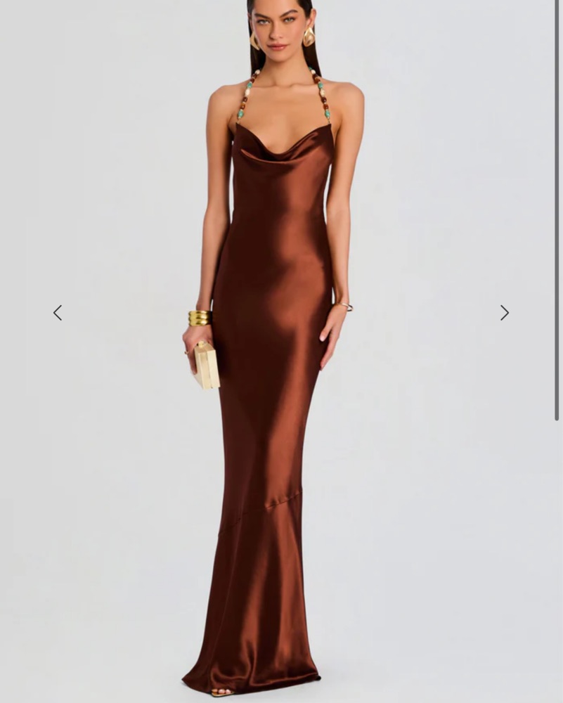 Satin fabric with beaded back. Had Hemmed and I am 5’5” please dry clean before returning