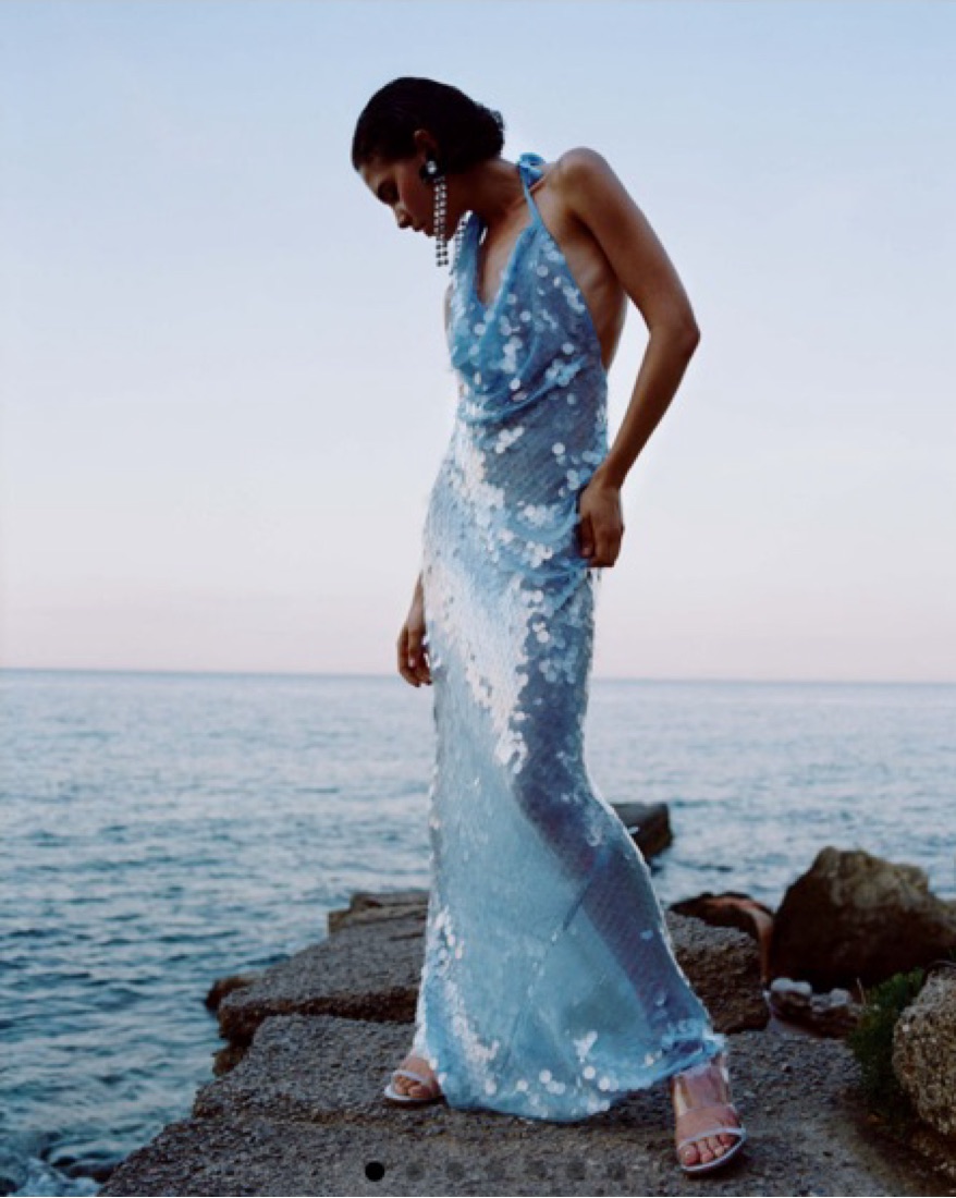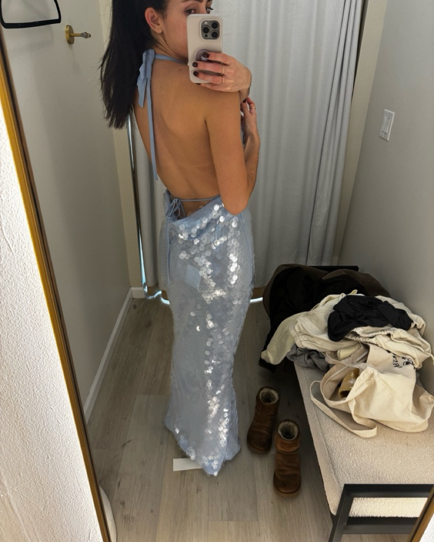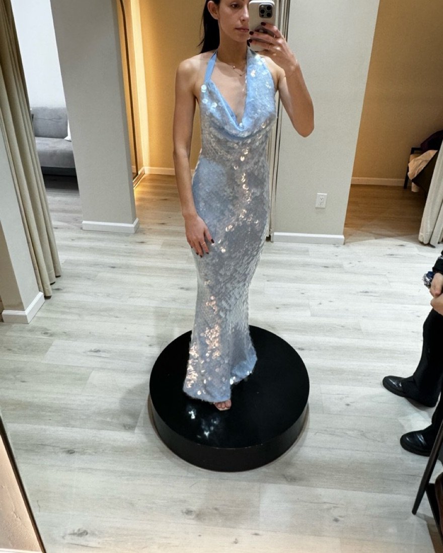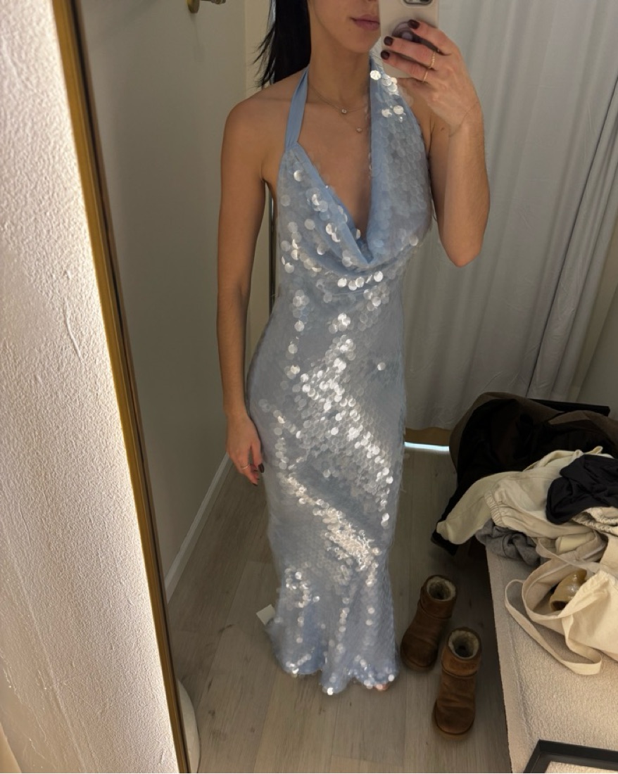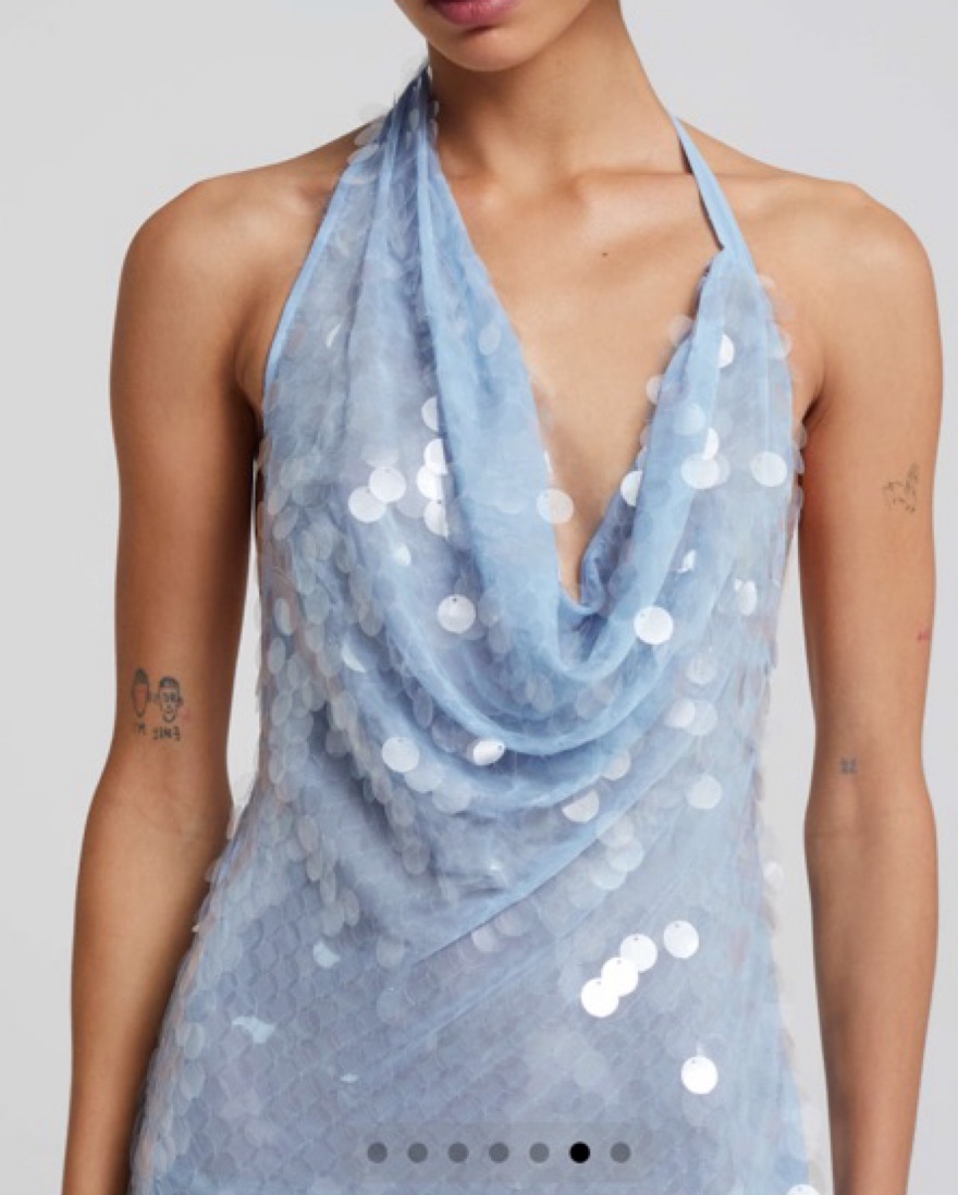 Drenched in cornflower blue paillettes from neckline to hem, Anais shimmers and glistens like the sun on water. An adjustable cowl neckline and waist tie makes it easy to find your perfect fit. Size on tag is XXS- but truly fits like an XS, I am 5’5, 25 waist and never an XXS and it fits perfect