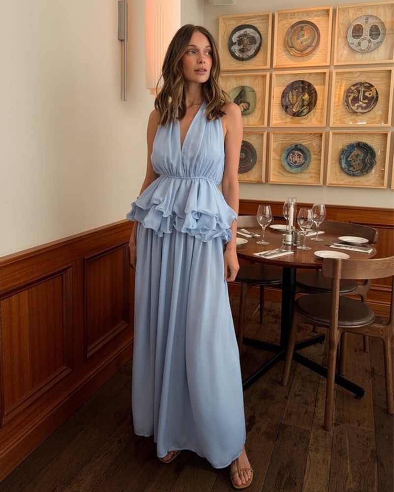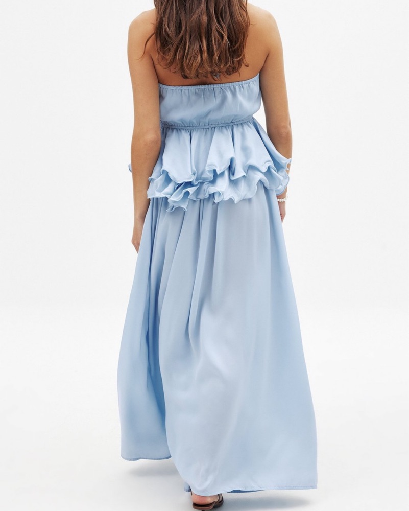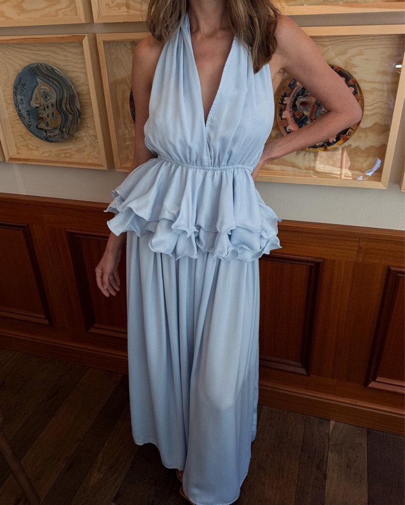 Both size S (EU 36) Top has an adjustable halterneck with a self-tie knot and a hook-and-eye closure at the front and an elasticized waist. The top has flounced details and a lining. Skirt has a flowy fit. It has gathered details and an elasticized waistband. Aqua light blue. Matching set