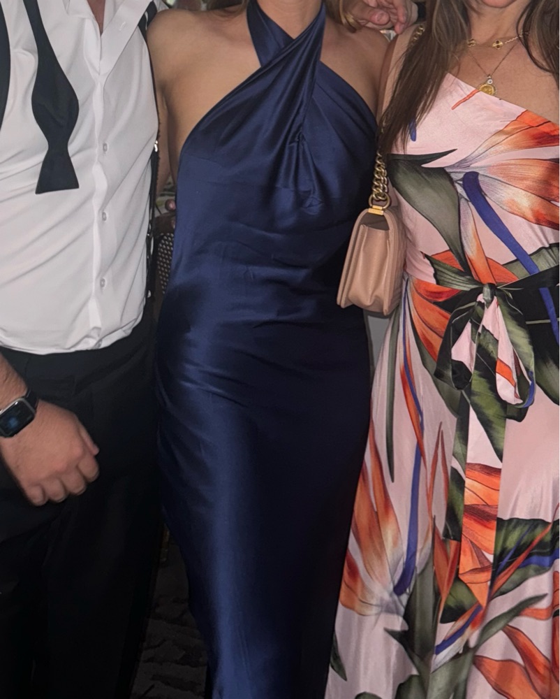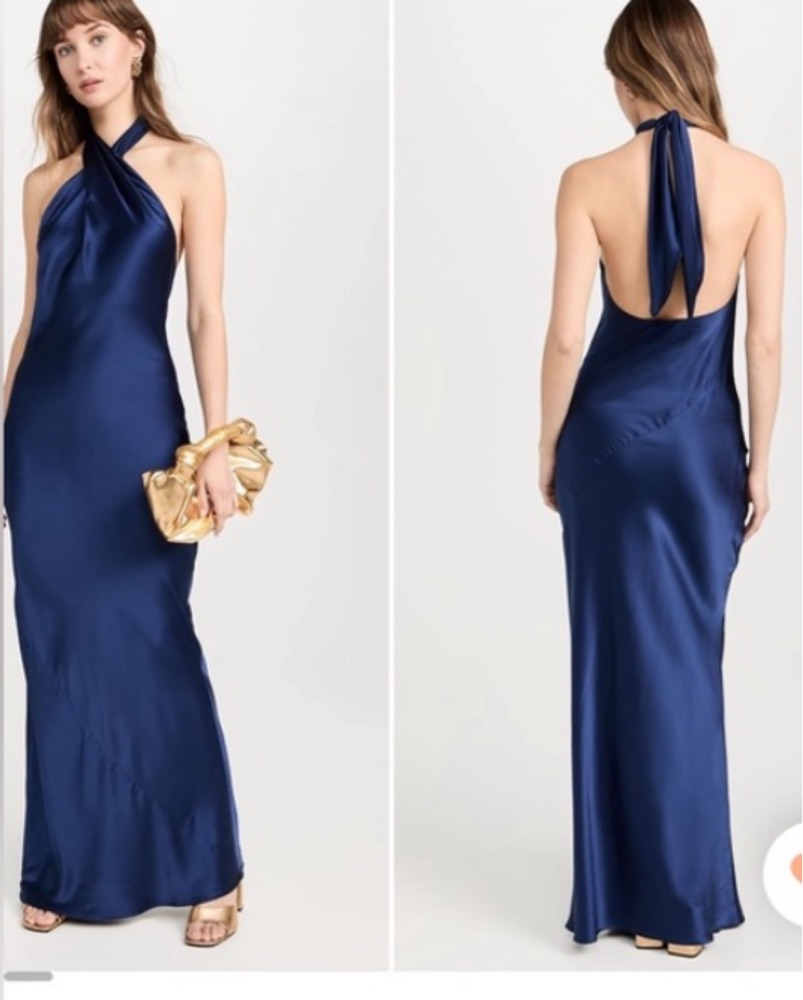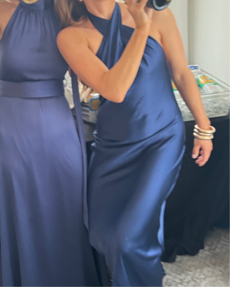 This stunning navy blue maxi dress is perfect for a formal event or special occasion. The halter neckline and flowing silhouette create a elegant, sophisticated look.