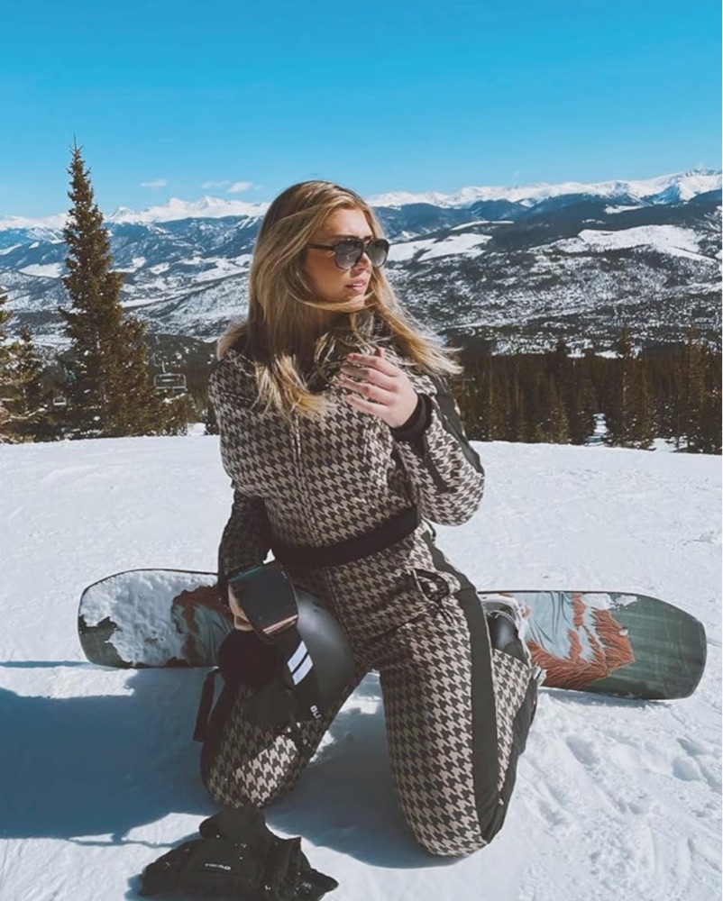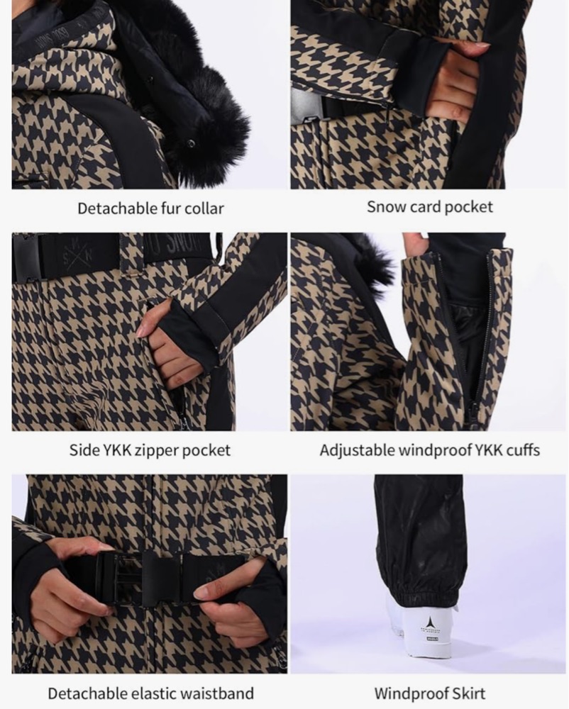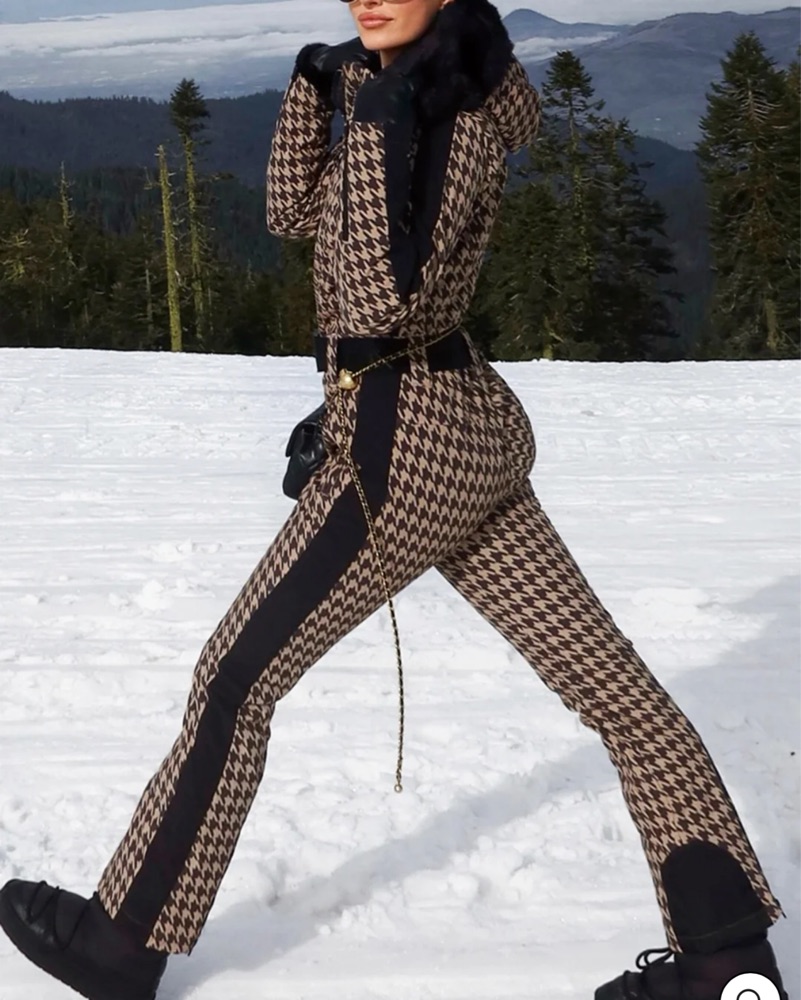 This versatile, high-fashion snowsuit is perfect for hitting the slopes in style. The bold houndstooth pattern and luxurious fur collar add a touch of glamour to your winter wardrobe.