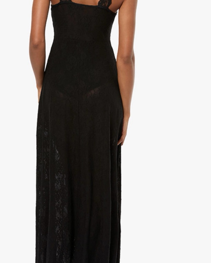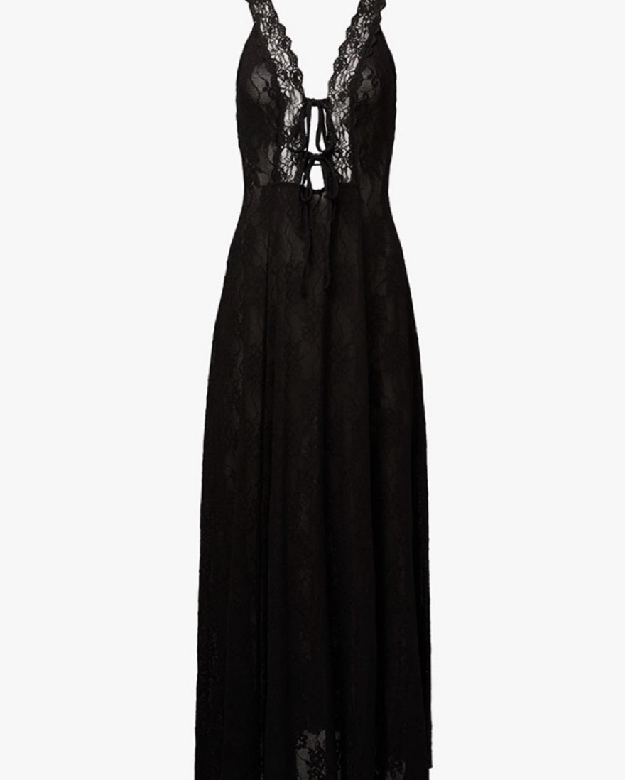 This stunning black maxi dress features intricate lace detailing for a sophisticated look. The plunging neckline and floor-length silhouette create a captivating, elegant aesthetic.