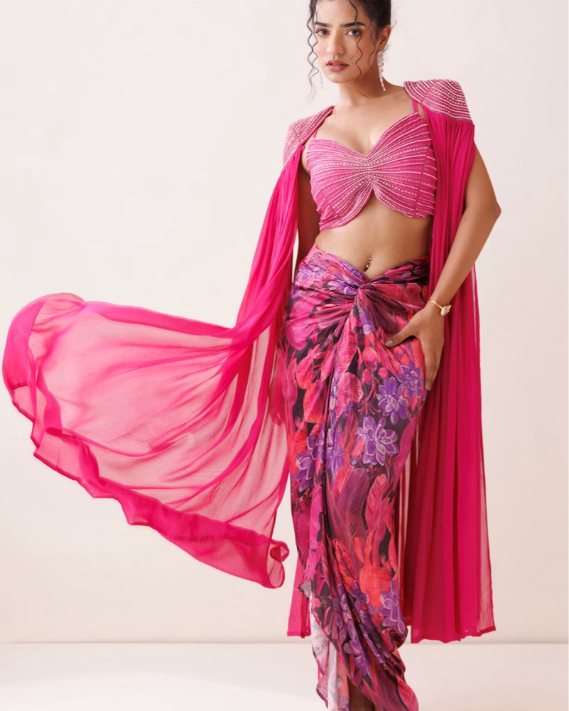 This stunning fuchsia set, featuring a bejeweled crop top and flowing floral maxi skirt, is perfect for an elegant evening event or a lavish wedding guest outfit.