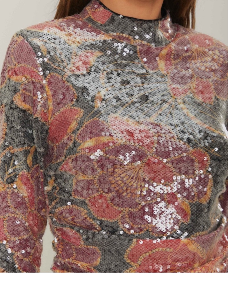 This sequin-embellished floral blouse is perfect for a night out or special occasion. The vibrant colors and shimmering details create an eye-catching, elegant look.