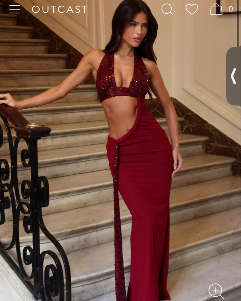Red/ burgundy outcast dress. Amazing quality. Halter neck ties at back. Zipper at the back of dress with slit in the back.