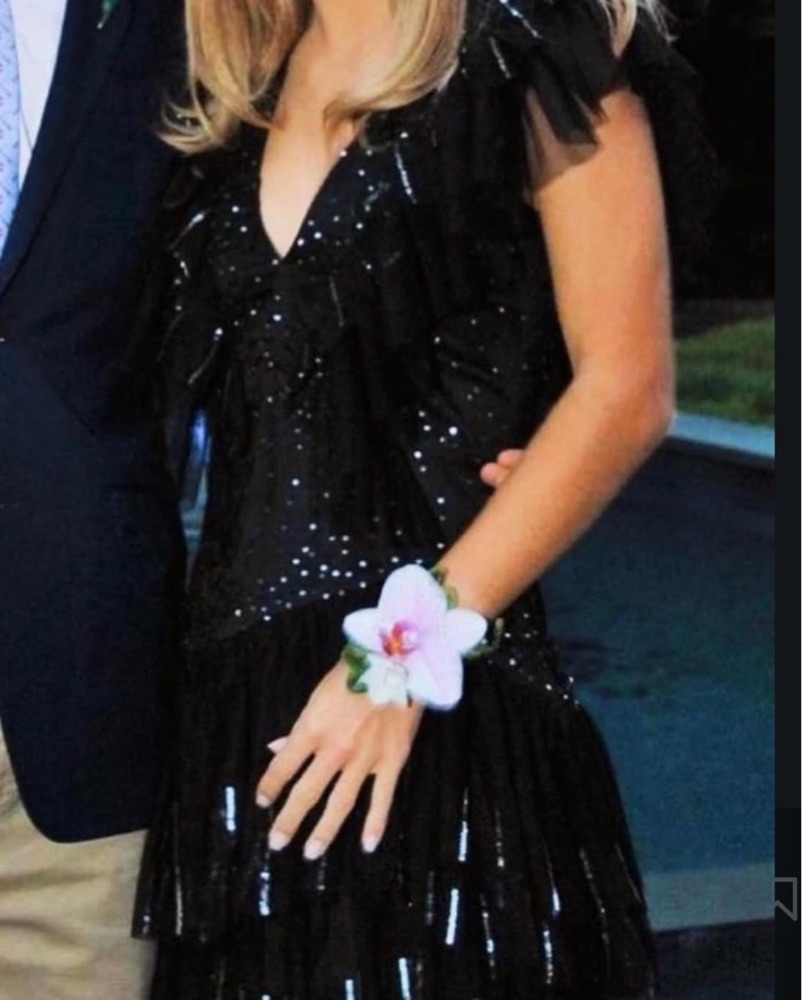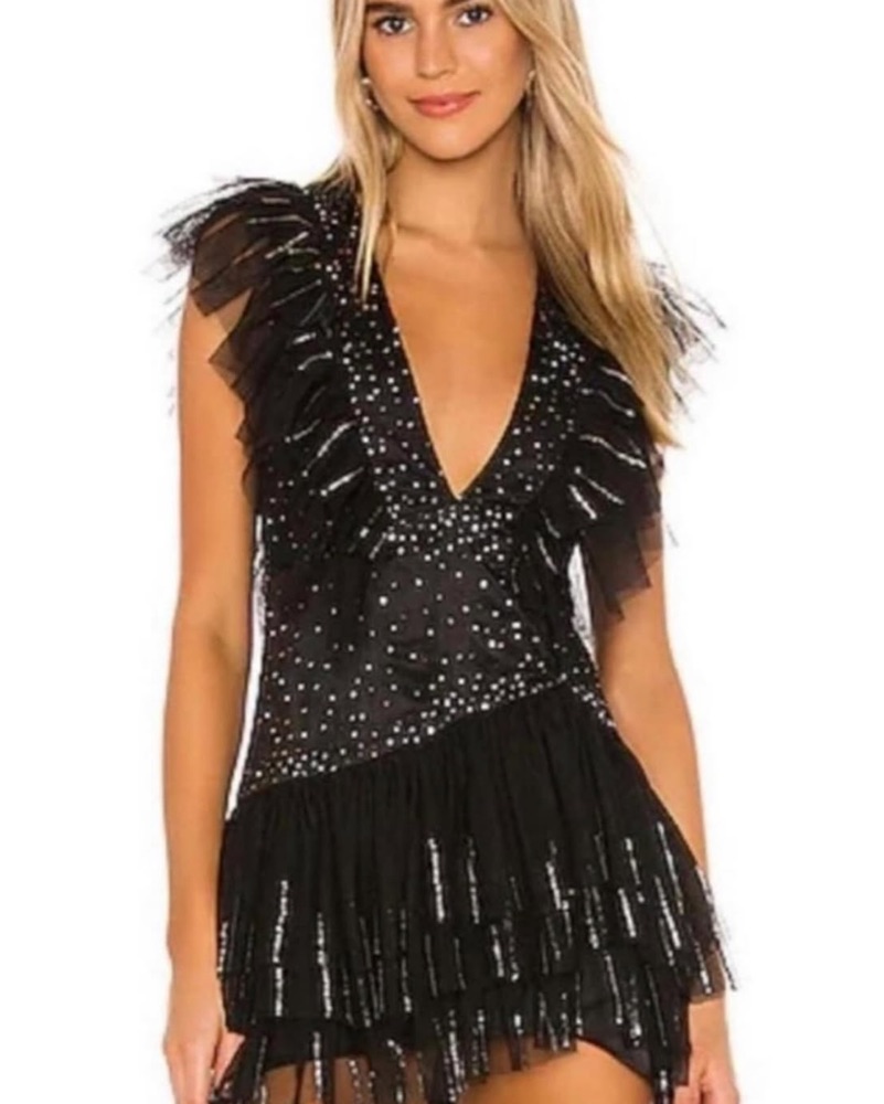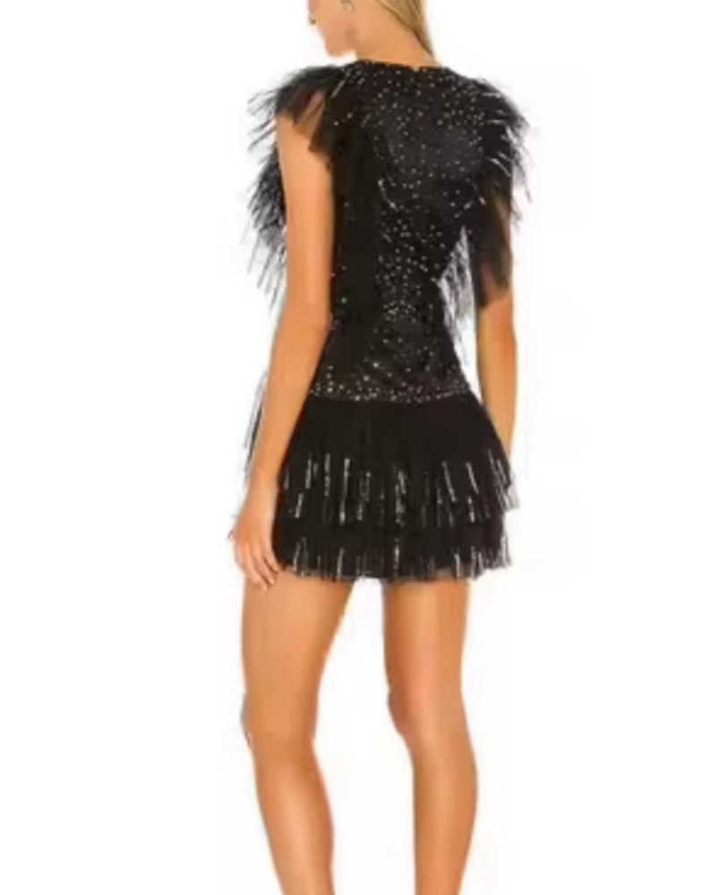 A glamorous cocktail dress featuring a tulle overlay covered in sparkling sequins and feather embellishments for a dramatic, party-ready look.