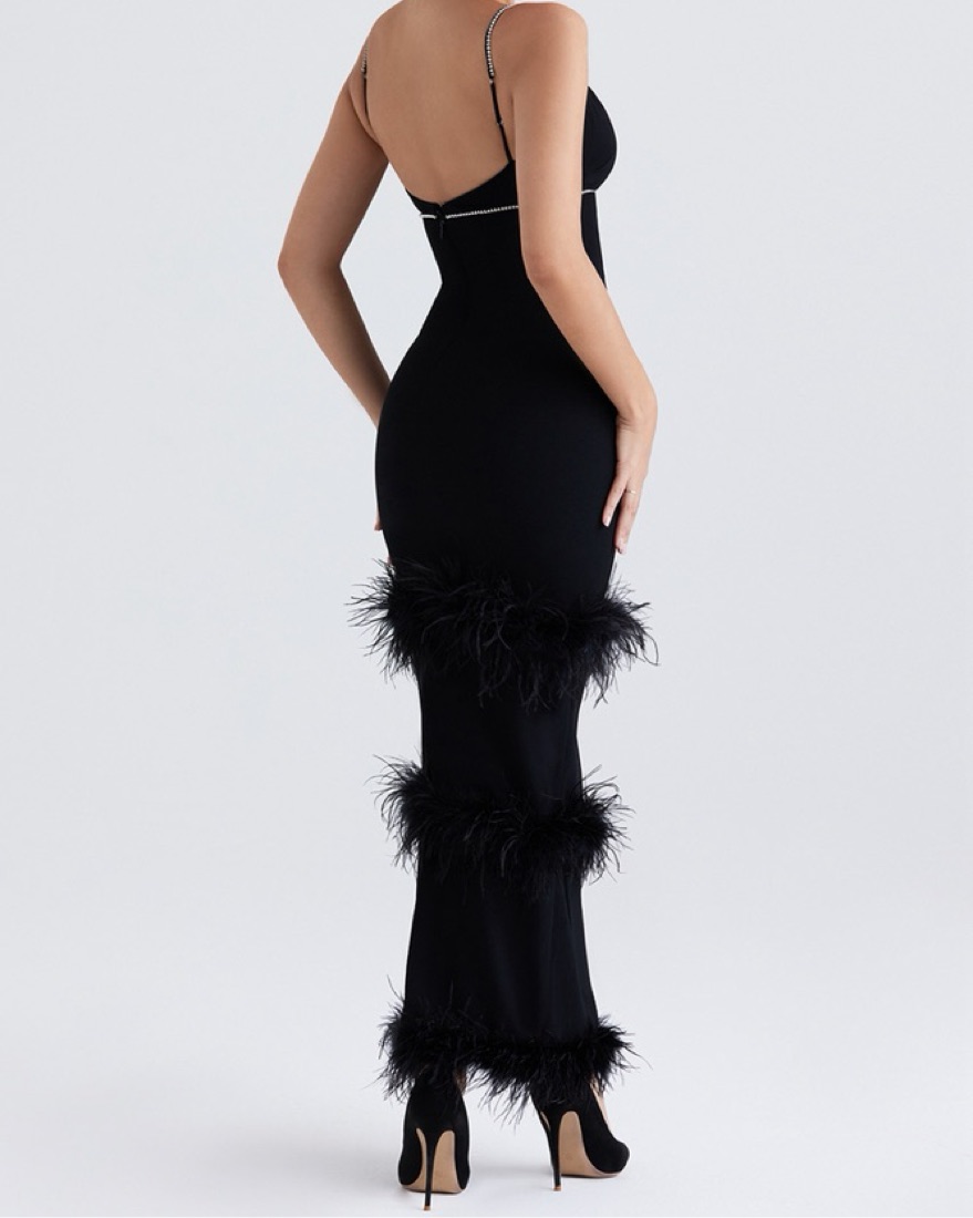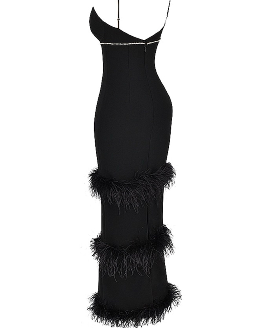 Cut from black stretch crepe, it's adorned with a trio of soft tonal feathers and traced with sparkling crystals to the plunging neckline, around the bodice and partially through the straps.