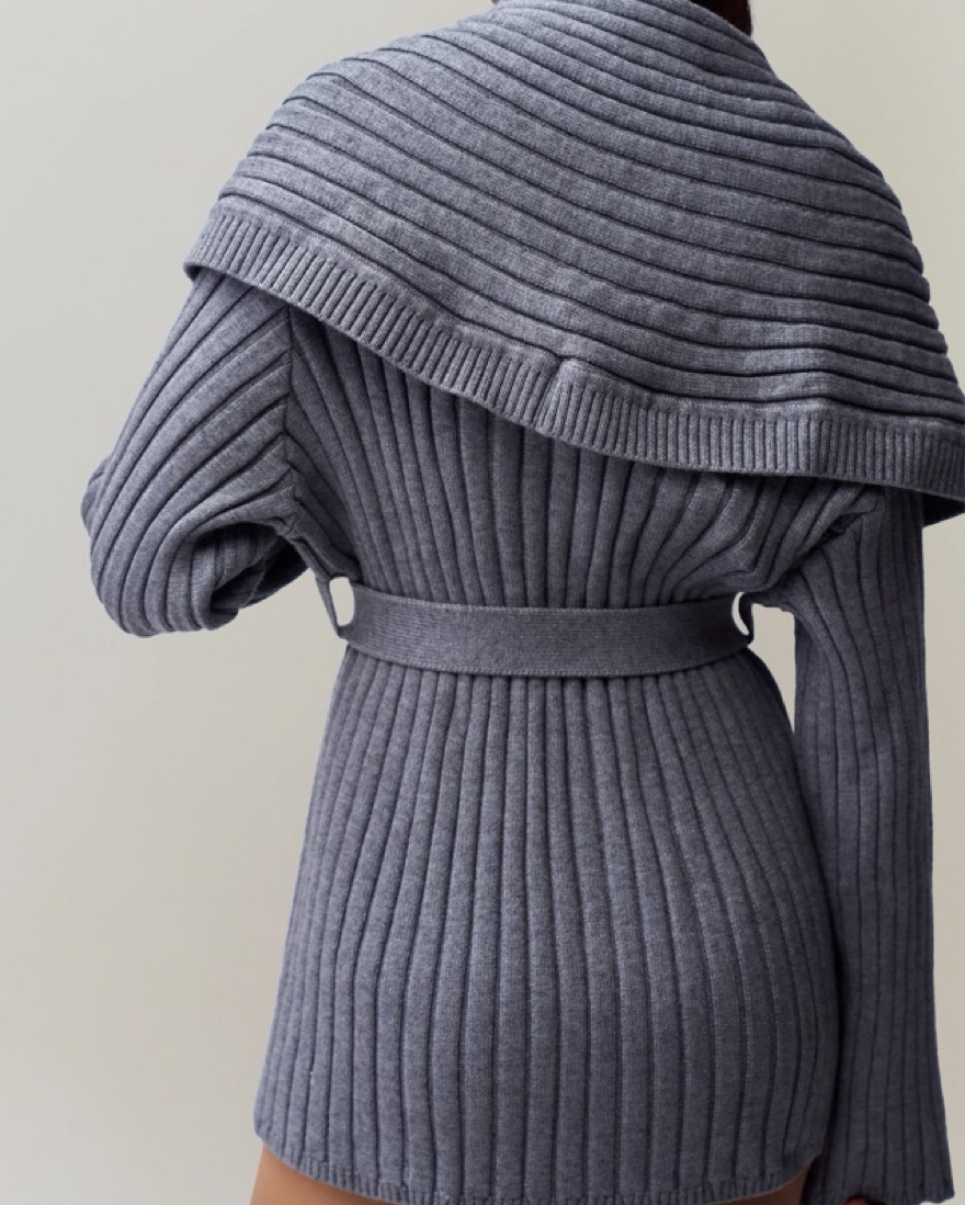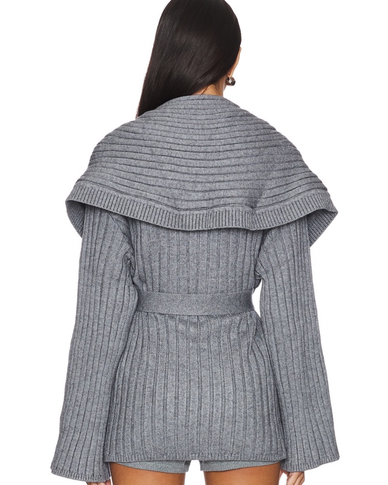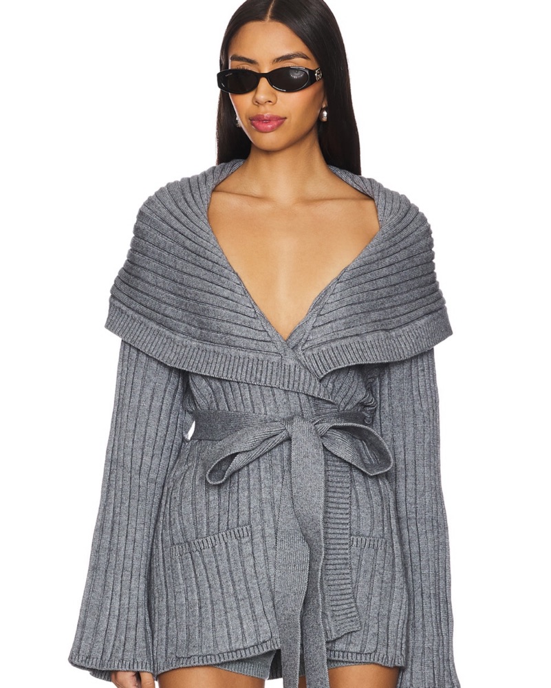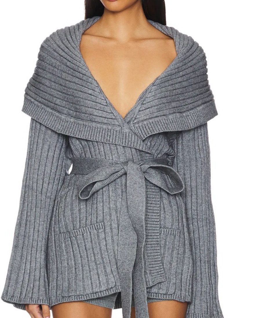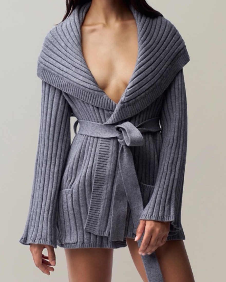 This plush gray knit dress with a wrap-style silhouette and belted waist is perfect for a casual weekend brunch or a cozy evening by the fire.