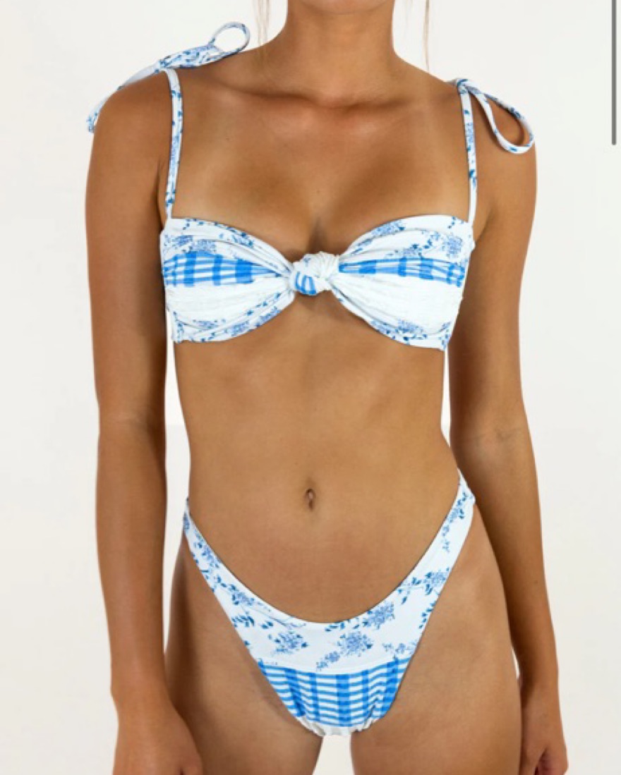 Monatuk bikini in blue floral. Cheeky and top is tie back. Size medium but can fit a small. Only tried on. Please return in perfect condition and clean. One of a kind