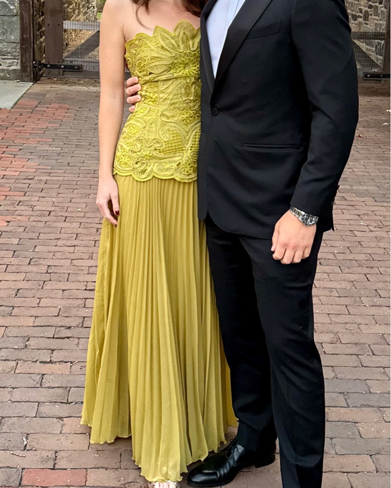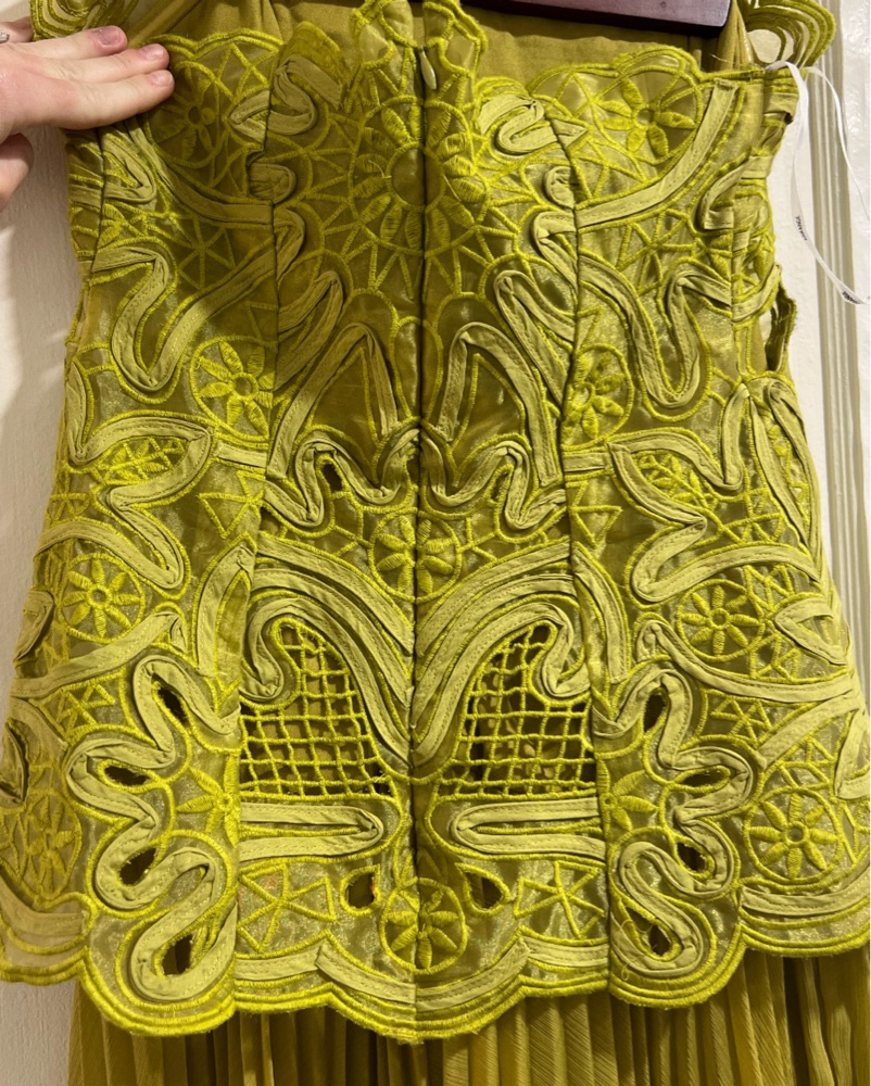 Embroidered corset top (zipper back) with flowing pleated fabric skirt. Bought in a size 6, but I had it tailored to fit closer to a size 2-4! Absolutely gorgeous and unique wedding guest dress.