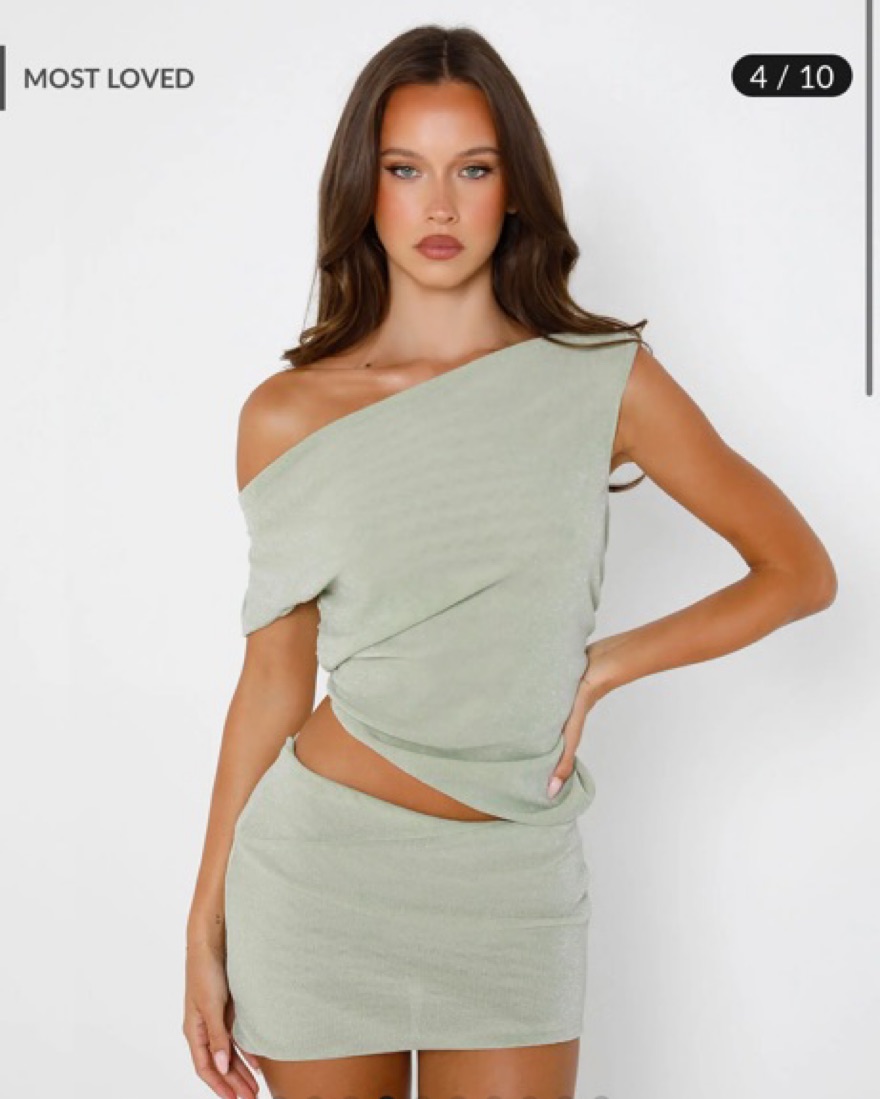 One Shoulder Shimmery Green Top + Matching Low Rise Skirt. Top & Skirt are both size Small!