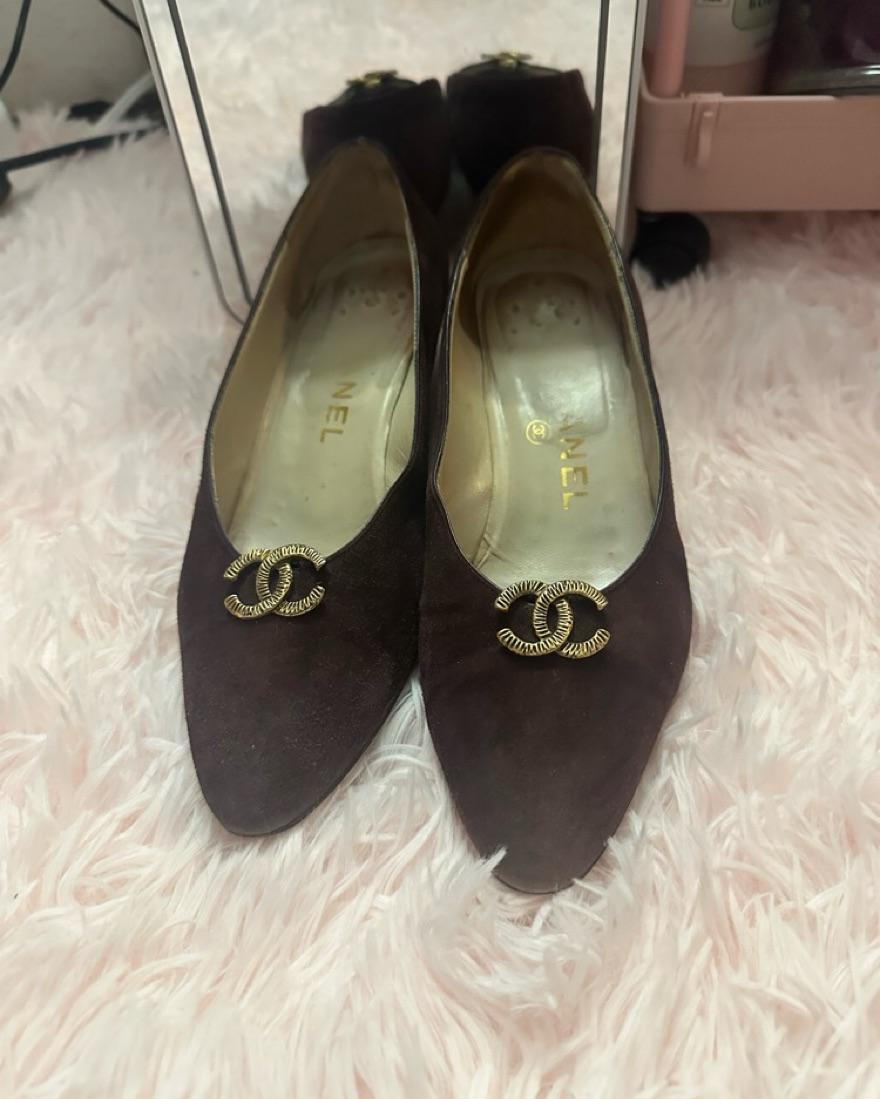 maroon Chanel pumps with gold CC detail and small heel. no exterior flaws, suede exterior, hardware in great condition. size 5.5.