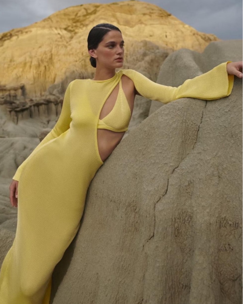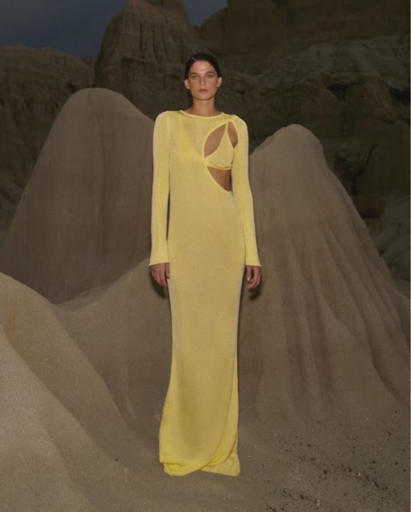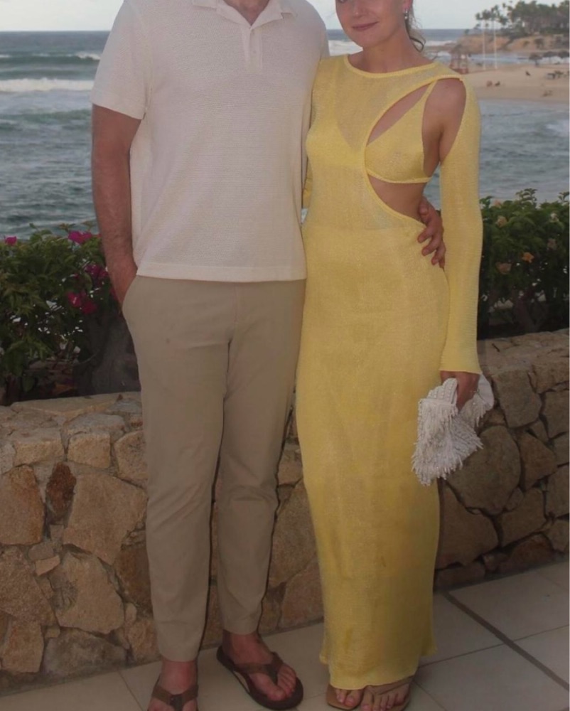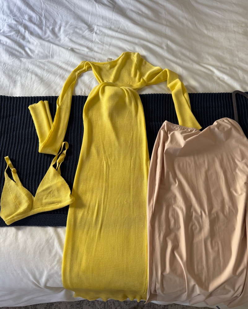 Three piece - bra top, dress overlay, nude underskirt. So flattering and cute! Two very small holes to the bottom of the skirt - not noticeable when wearing.