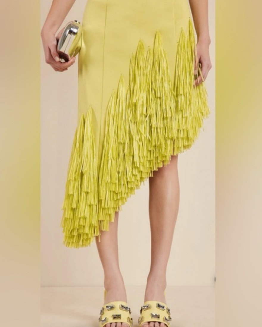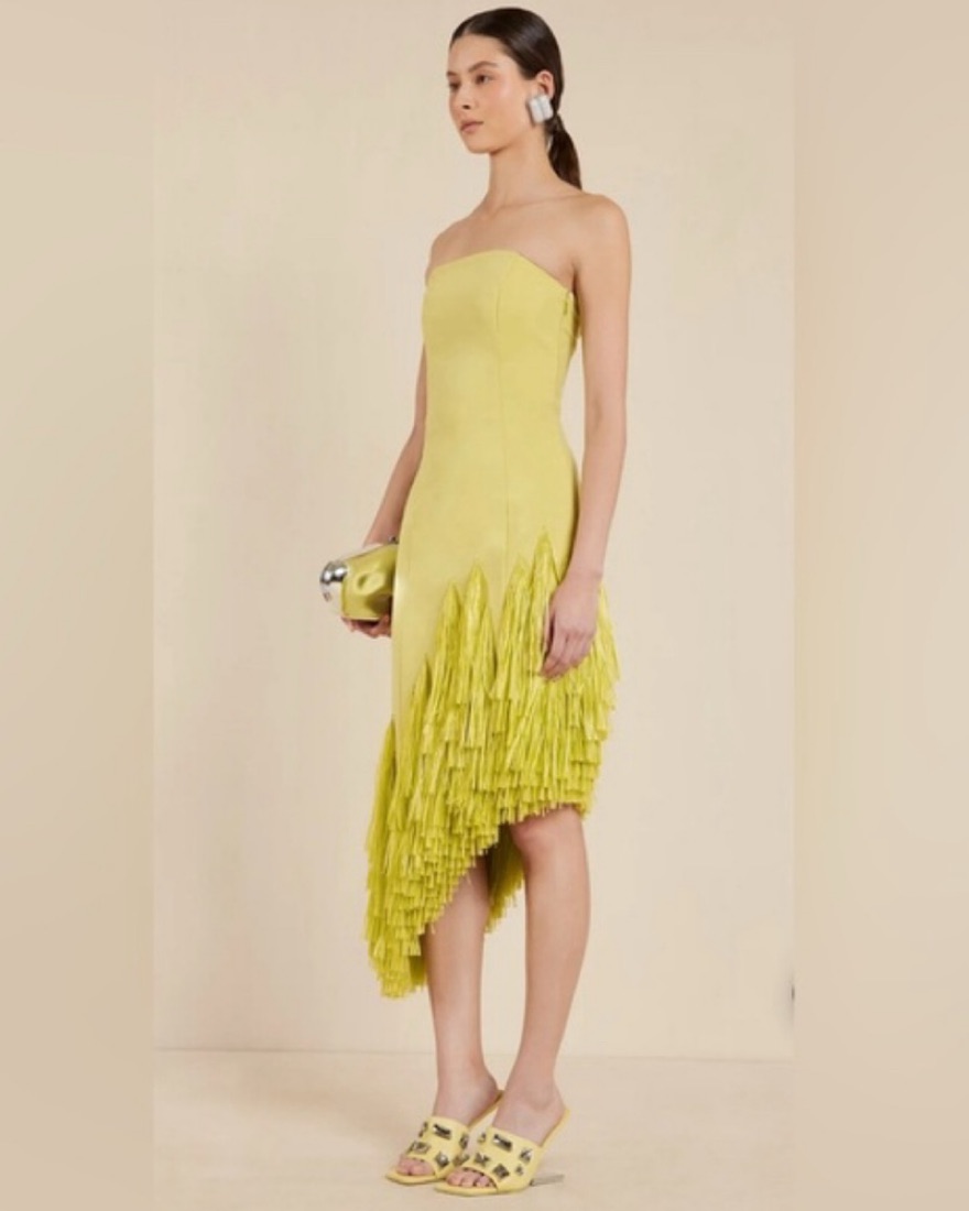 Libby is an artisanal gown featuring hand-embroidered raffia fringe. There is an