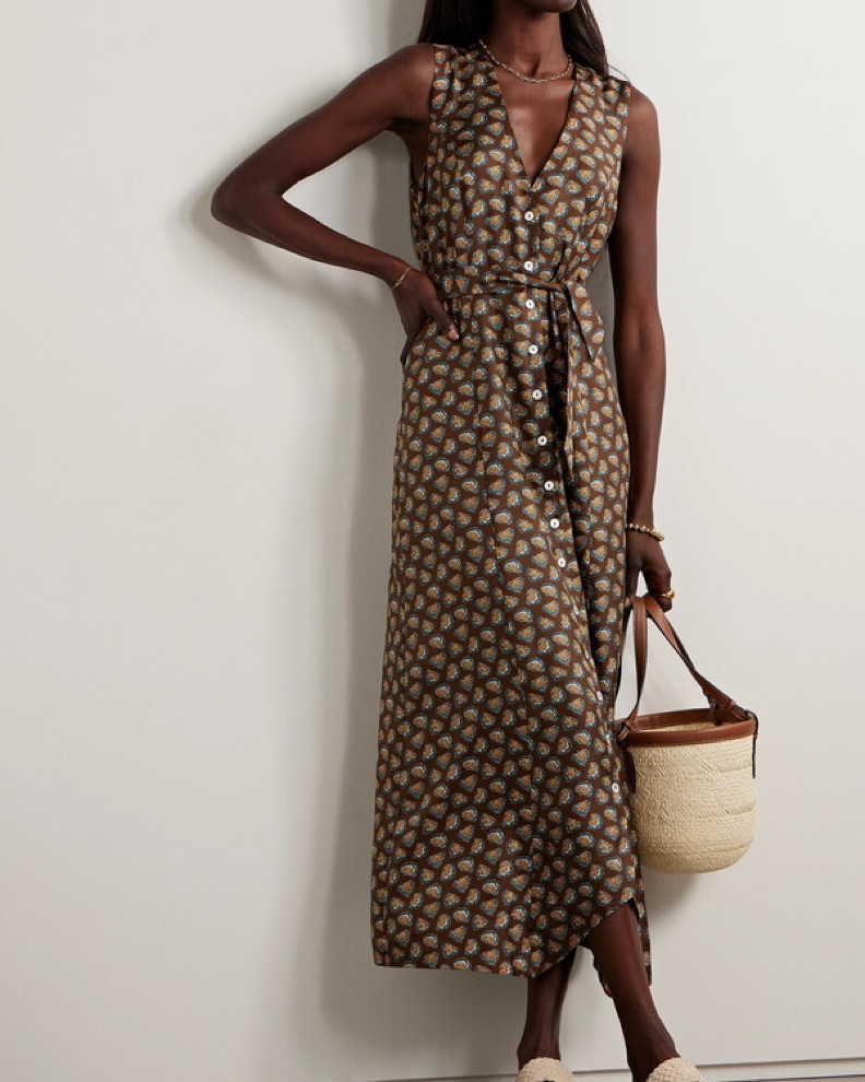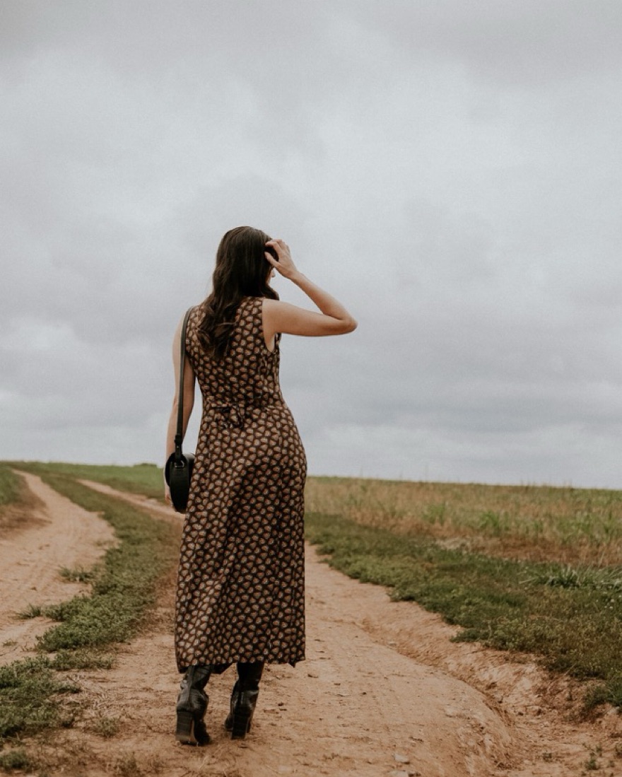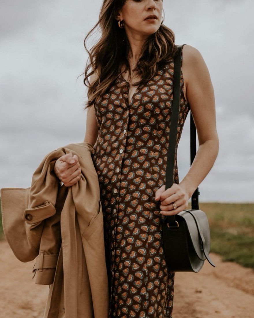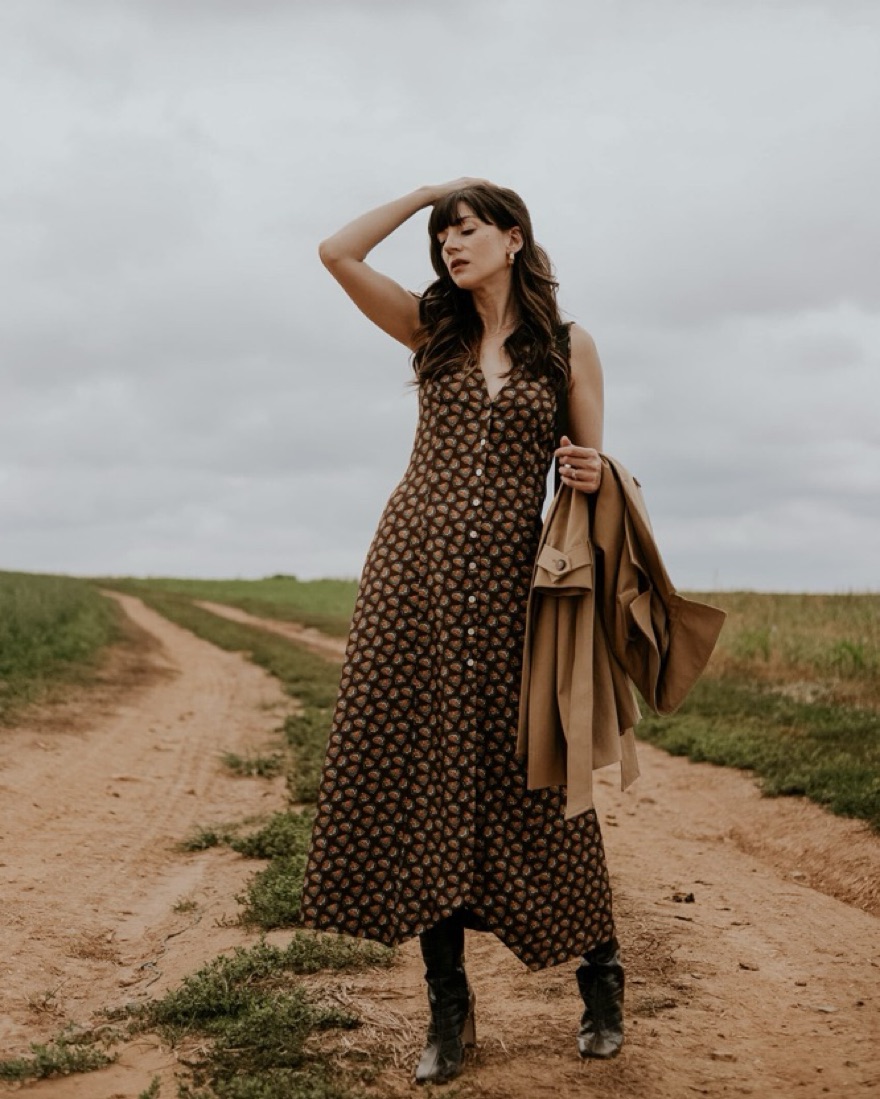 Silk Midi from Doên! I got engaged in this dress, so flattering and easy. All silk with button front and self-tie back with handkerchief hem. I’m 5’1” 🤎