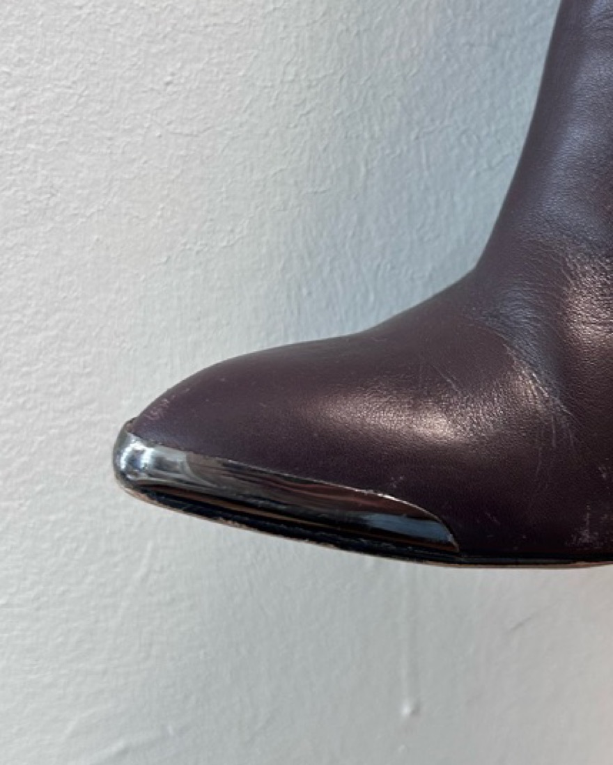 Thigh, high brown boots, with adjustable zippers on side to account for calf width, heel about 3.5 inches, pairs great withy the brown Marc Jacobs coat ;)