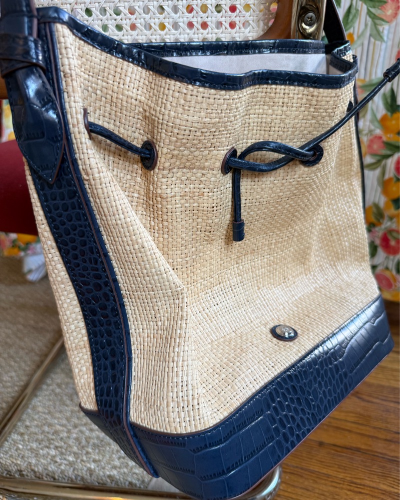 Pamela Munson chic summer bucket bag — navy leather & raffia