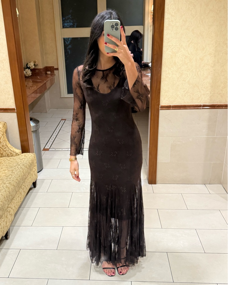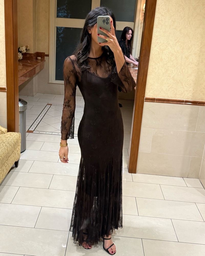 Long sleeve brown lace dress with long slip (I also have a short slip if interested). Perfect for fall or winter weddings! Bought in Italy- the brand is Ossygeno. I am 5’7 wearing 3 inch heels and it fell about 2-3 inches above the floor.