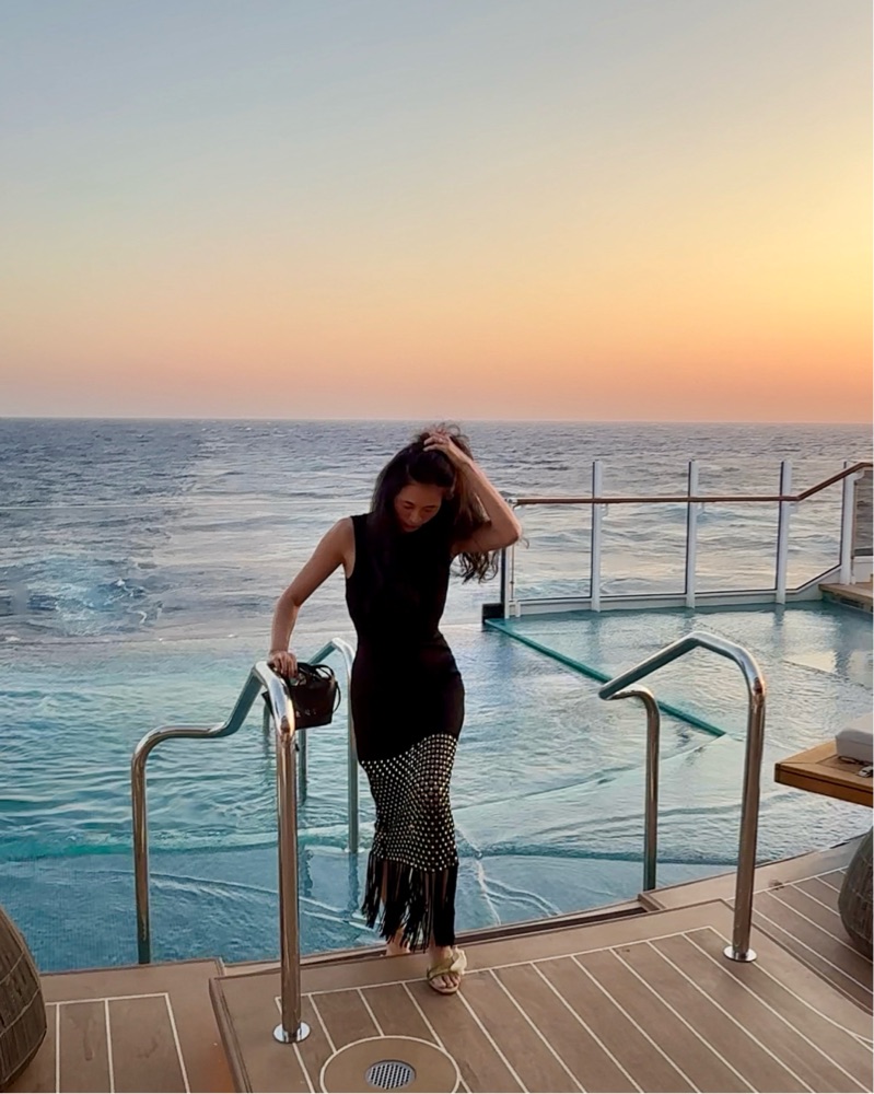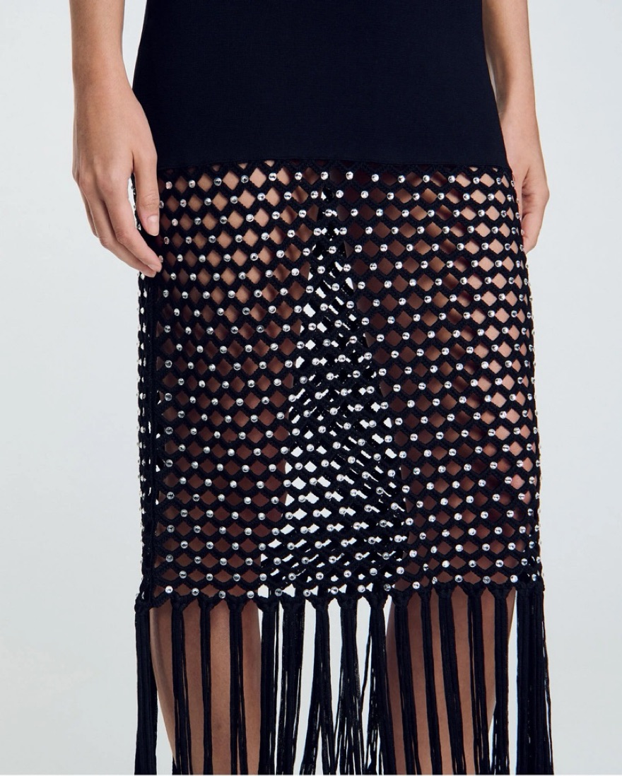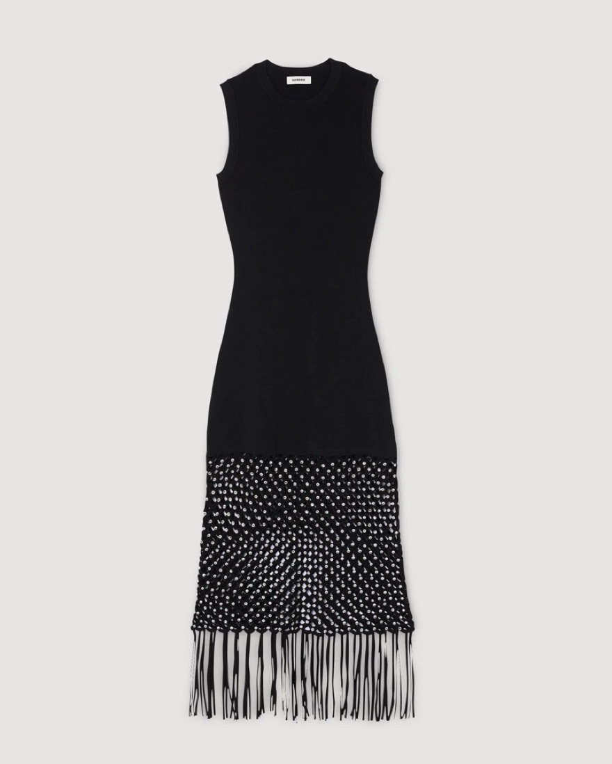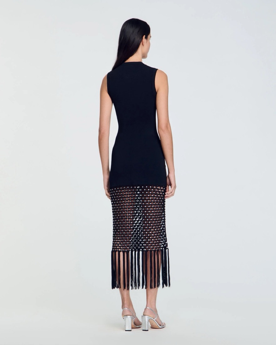 Sleeveless maxi dress in milano stretch knit, featuring a round neck, fringed bottom and a knit skirt with a rhinestone-embellished crochet effect. Wearing a size 38 / US 6. Bandage knit fabric so can fit a variety of sizes